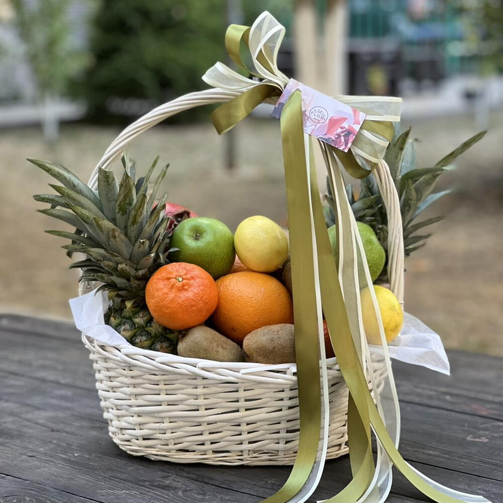 Warenkorb - 1 Stk. Granatapfel - 1 Stk. Kiwi - 2 Stk. Satinband - 2 Stk. Zitrone - 2 Stk. Orangen - 2 Stk. Яблоки - 5 Stk. мандарины - 3 Stk. ананасы - 2 Stk.