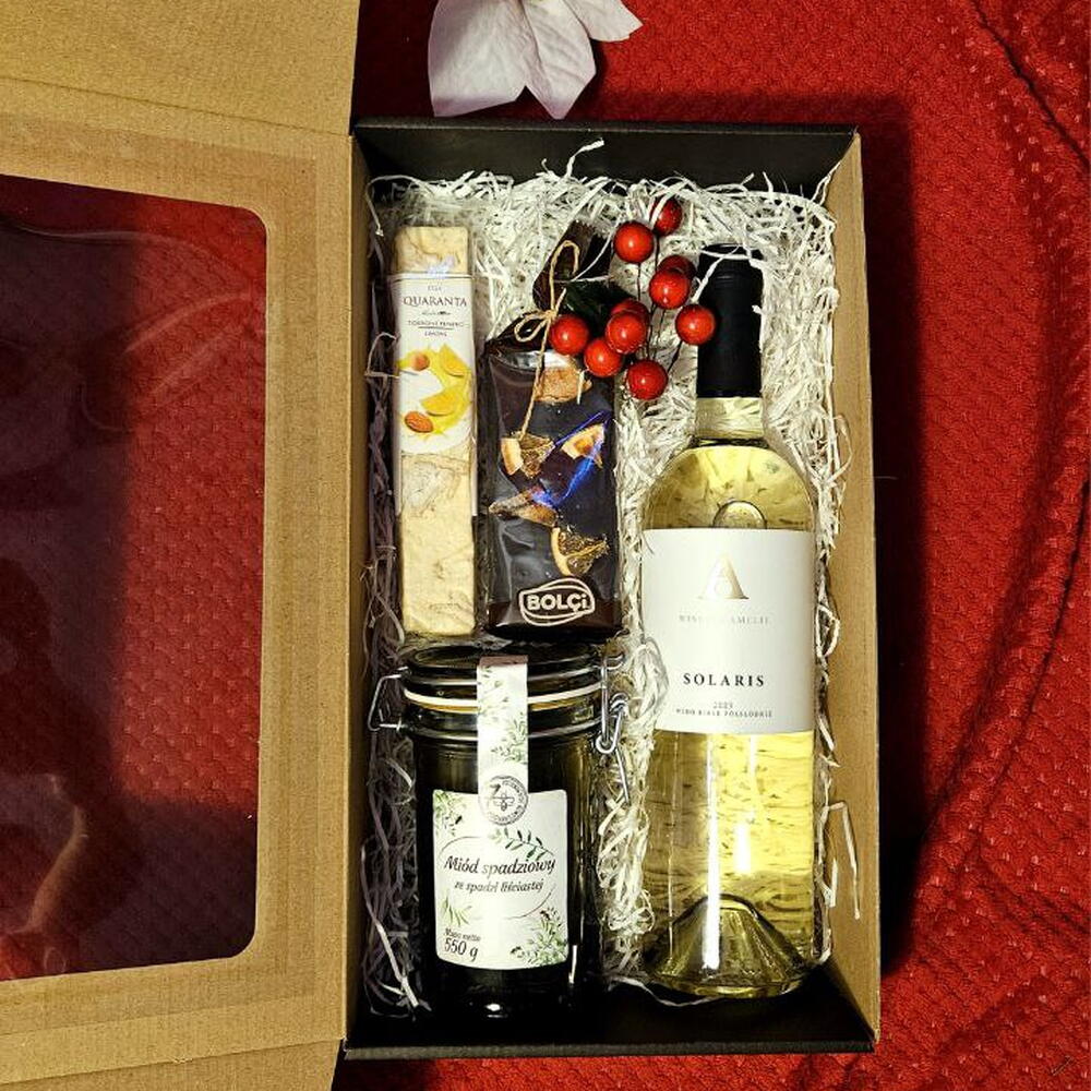 halbsüßer Weißwein Solaris - 1 Stk. Honigmelonenhonig aus blättrigen Honigmelonen - 1 Stk. weicher nougat mit zitronencreme und zitronenschale - 1 Stk. Dunkle Schokolade mit Früchten - 1 Stk.