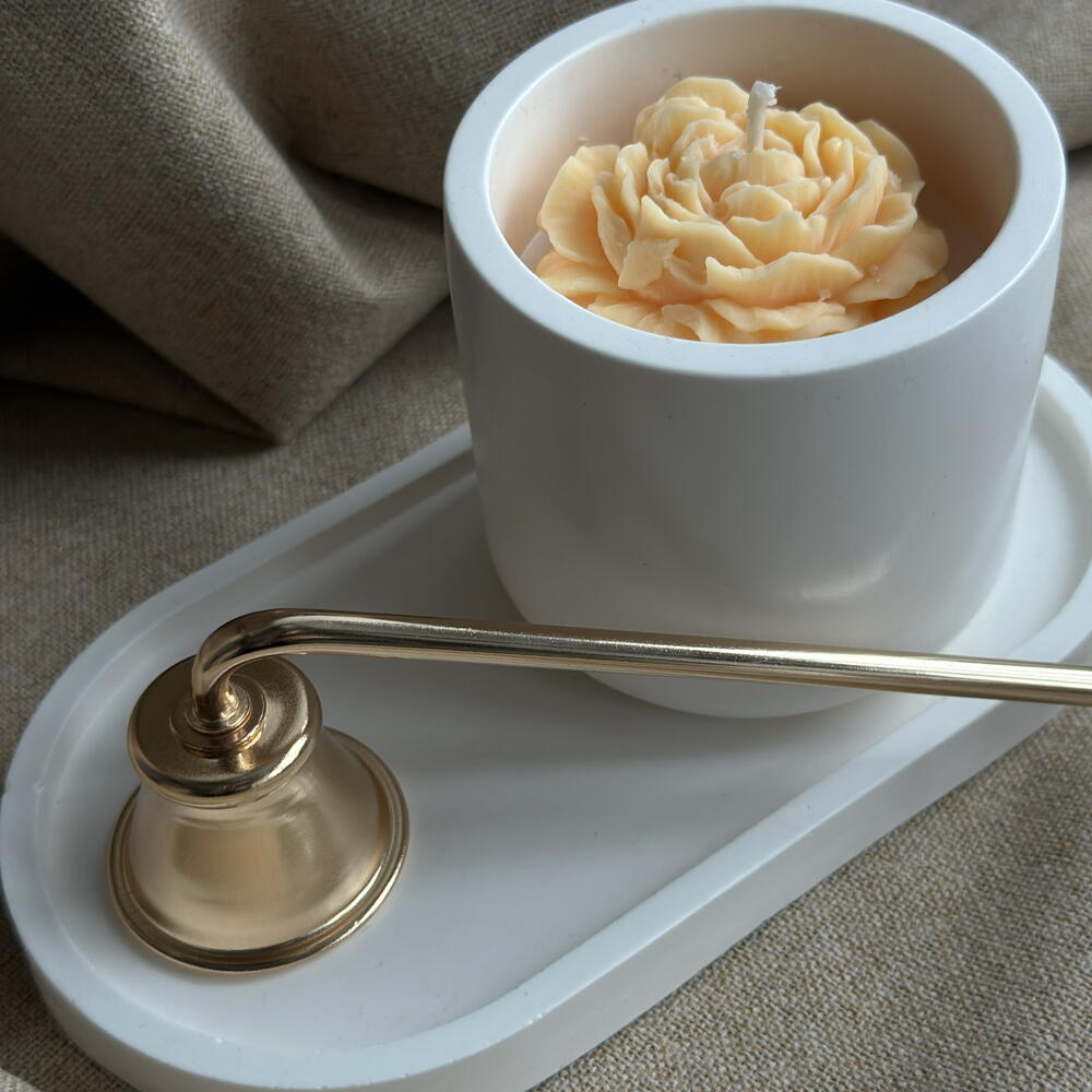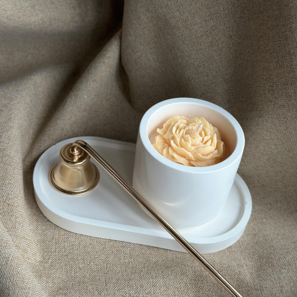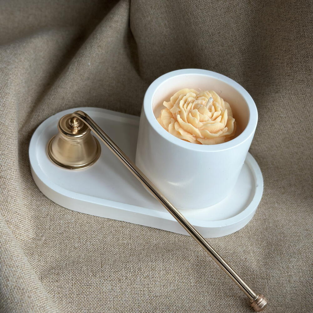 Elegant set of a handmade soy candle in a plaster candle holder, decorated with a three-dimensional peach-colored peony flower. The set is completed by a decorative plaster base and a stylish candle snuffer that allows you to extinguish the flame safely and aesthetically. Each element of the set is handmade with attention to detail. Natural soy wax and the minimalist form of plaster create a harmonious, aesthetic composition, ideal for modern and classic interiors. A delicate peony fragrance fills the space with a subtle, floral note, creating an atmosphere of calm and coziness. Suitable for: • creating a cozy atmosphere at home • an elegant gift for a birthday, housewarming, or a special occasion • stylish interior decoration In the set: • soy candle in a plaster candle holder with a peach peony flower • decorative plaster base • candle snuffer Candle snuffer color: gold or silver Materials: soy wax, plaster Handmade