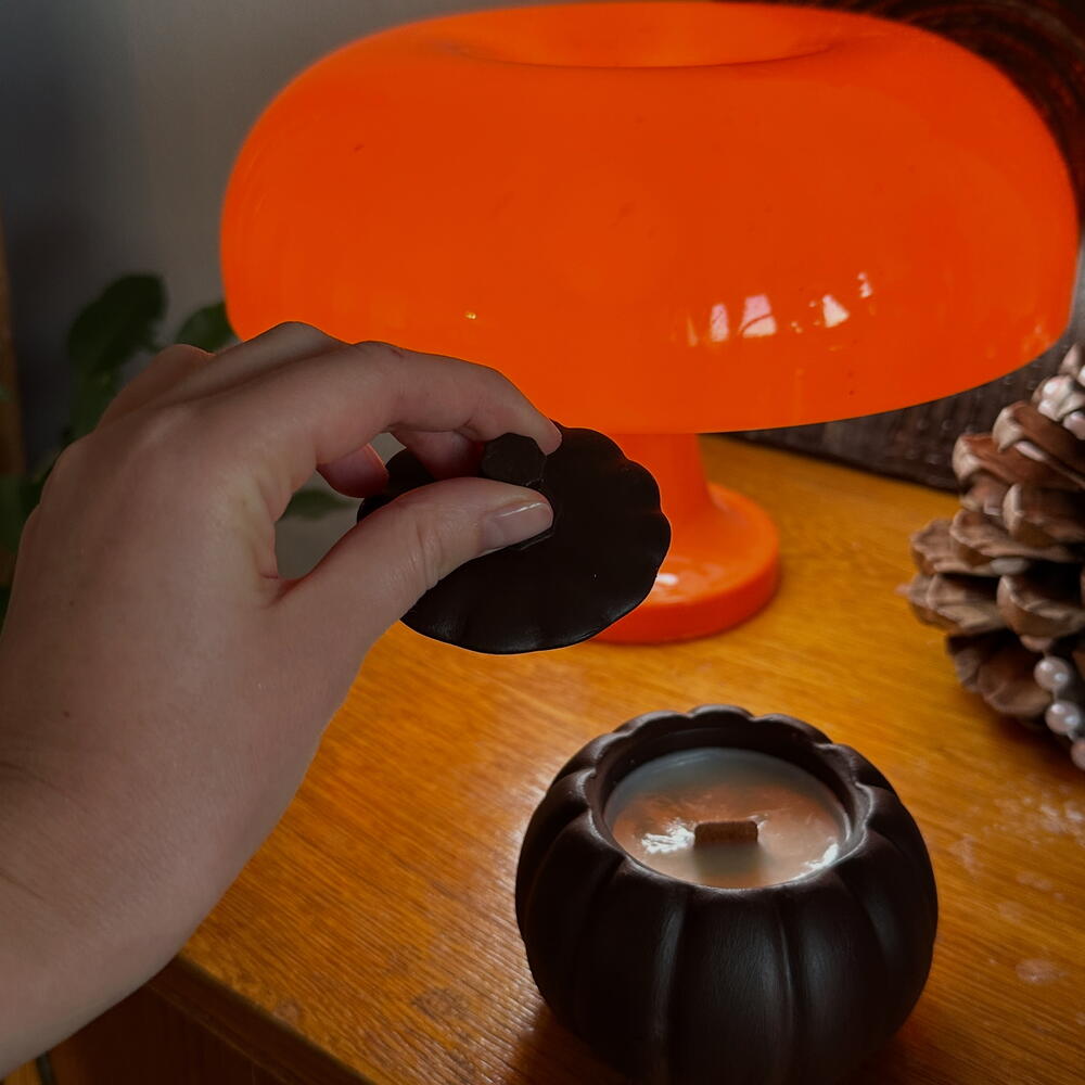 A handmade soy candle in a pumpkin-shaped plaster holder, designed to bring a touch of autumn warmth and festive charm to any space. Each piece is handcrafted with care—a perfect accent for cozy evenings or Halloween gatherings. The scent opens with juicy orange, adding freshness and a hint of celebration. At the heart, cinnamon and clove evoke the comforting aroma of homemade treats. Finally, soft vanilla and honey embrace the composition, creating a cozy, sweet aura. ⸻ This handmade soy candle, set in a pumpkin-shaped plaster candle holder, is the quintessence of autumn charm and holiday warmth. Each piece is unique—created with attention to detail and artistic flair. Perfect for long, cool evenings or as a unique gift. The candle's scent opens with juicy orange, bringing freshness and joy. At its heart, notes of cinnamon and clove resonate, reminiscent of the aroma of homemade baked goods. Delicate vanilla and honey envelop the whole, creating a cozy, sweet aura.
