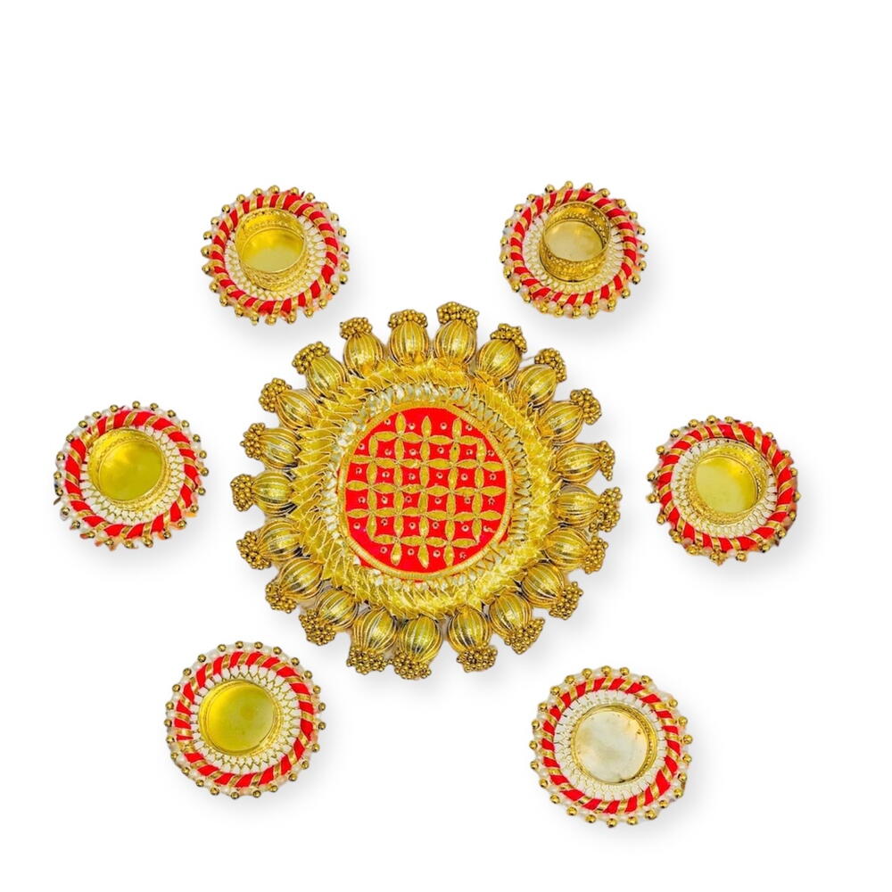 A set of 6 Small candle holders and 1 central rangoli. Festival Decoration Item Single candle holders comes in beautiful gift box You can gift someone for diwali Or Can use to decor your Diwali Or use it as a return gift DECORATION Item 💫 For home Office Karwachauth, Pooja, Diwali, wedding, Haldi, Mehndi etc 👇👇👇👇👇👇👇👇👇👇👇👇 This is a Multi-Purpose Item used for : ▪︎Weeding Decoration ▪︎Haldi and Mehndi Decoration ▪︎Diwali Decoration ▪︎House Entrance Decoration ▪︎Karwachauth Best quality product