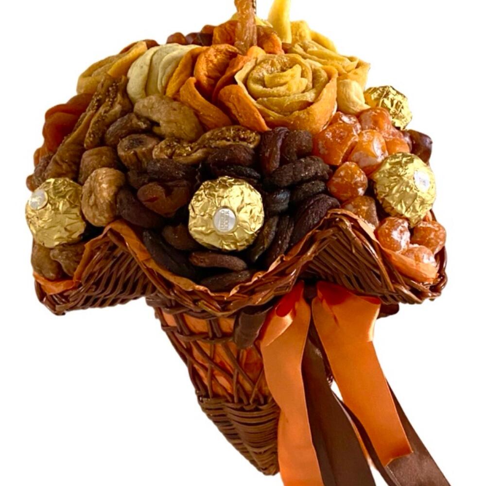 Ferrero rocher - 5 pcs dried mango - 250 g kumquat - 100 g dates - 100 g dried figs - 100 g dried pears - 100 g two types of dried apricots - 350 g dried peaches - 100 g dried apples - 50 g
