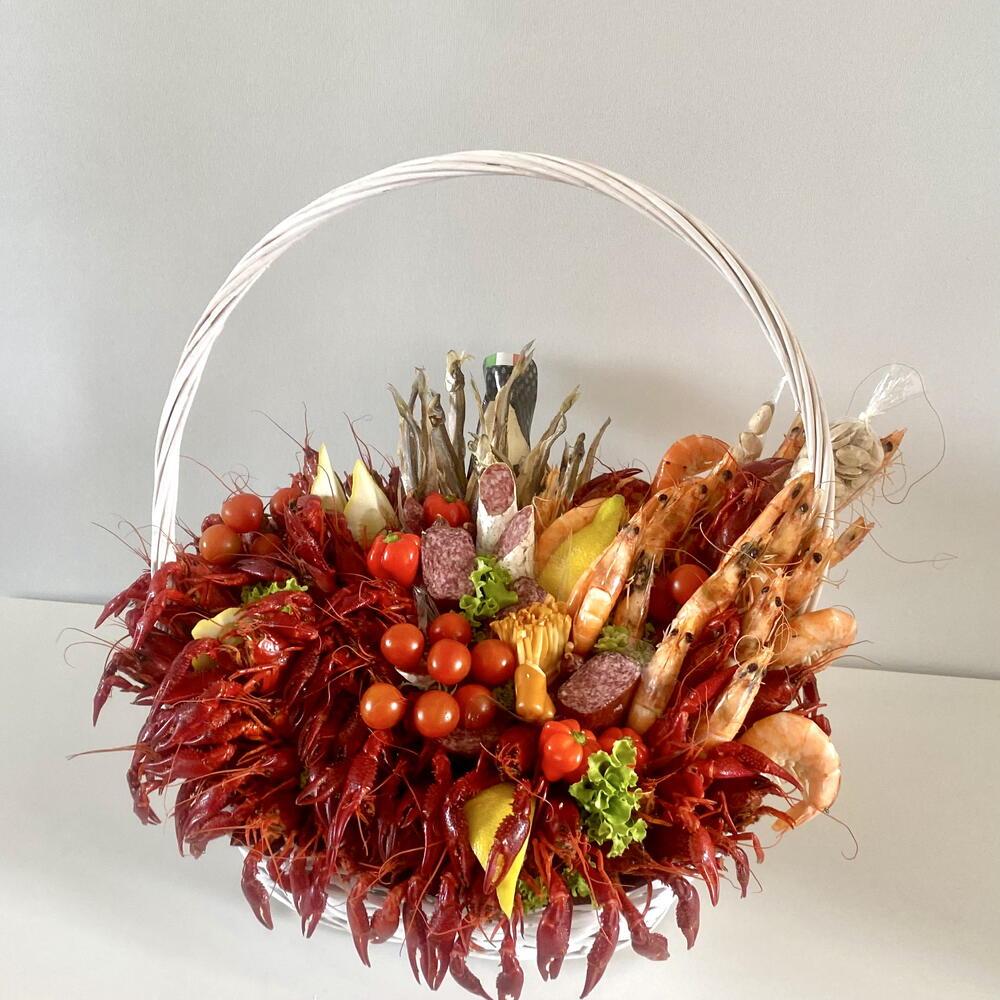 Pistachio - 100 g lemon - 1 pcs peanuts - 50 g cherry tomatoes - 7 pcs chilli pepper - 5 pcs salami - 250 g fuet - 180 g fish - 200 g korilius - 1 pcs shrimps - 1000 g crayfish - 2000 g hard cheese - 150 g crabs (if available) - 2 pcs cheese chechil - 100 g