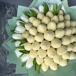 Delicate and sensual bouquet of strawberries in white chocolate Callebaut with the addition of white tulips.