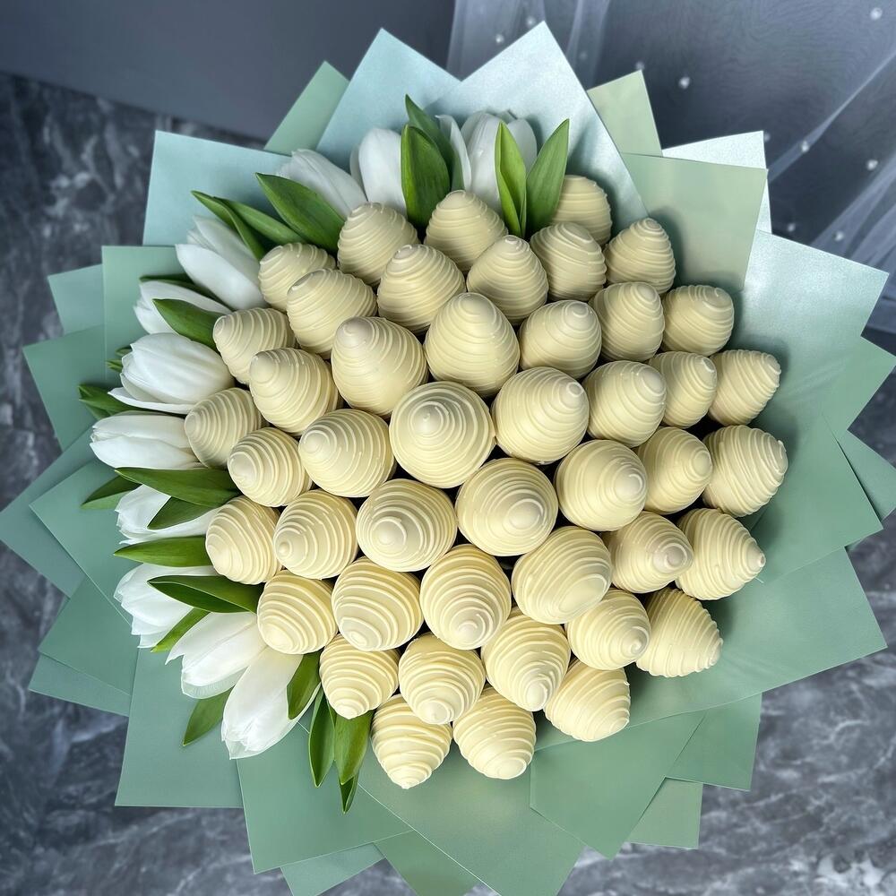 Delicate and sensual bouquet of strawberries in white chocolate Callebaut with the addition of white tulips.