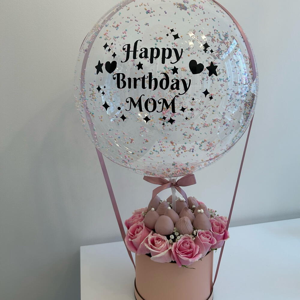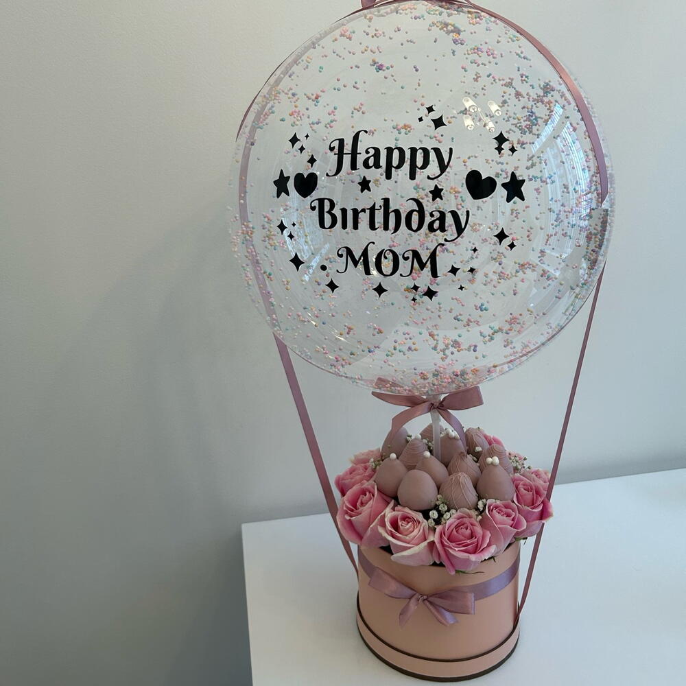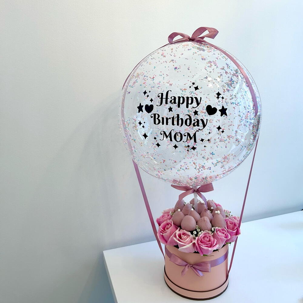 bobo balloon - 1 pcs chocolate covered strawberries - 12 pcs fresh roses - 12 pcs sticker “happy birthday mom” - 1 pcs