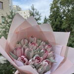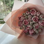 Elegant bouquet of zephyr tulips — a handcrafted, premium sweet composition with a diameter of 20 cm. The tulips are made of apple-vanilla zephyr based on natural fruit puree. Ingredients: fruit puree, pasteurized egg white, sugar, and agar. Texture — light, fluffy, and melts in the mouth. The bouquet contains approximately 15–20 tulips. The number of flowers may vary slightly depending on the size of individual tulips while maintaining the 20 cm diameter. If you prefer a specific number of flowers, please contact us before placing your order. The bouquet is carefully packaged — additionally secured with transparent protective film for transport. The colors of the tulips and the packaging are chosen individually when ordering and may differ from those shown in the photo. Shelf life: up to 7 days from the production date, in a sealed package.