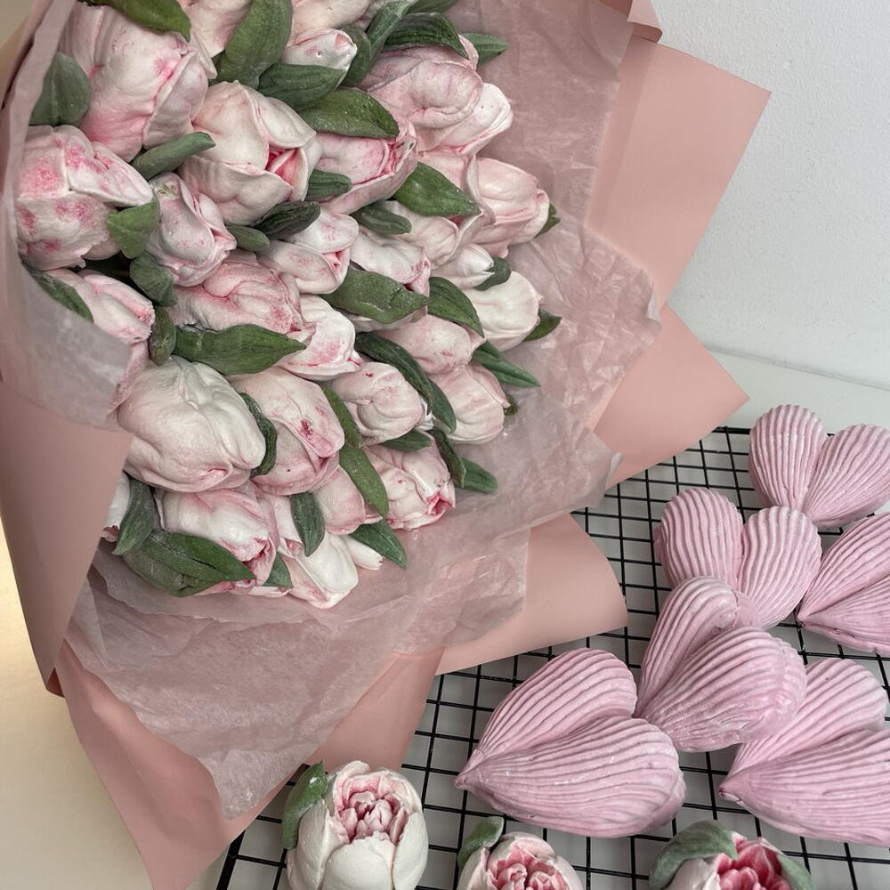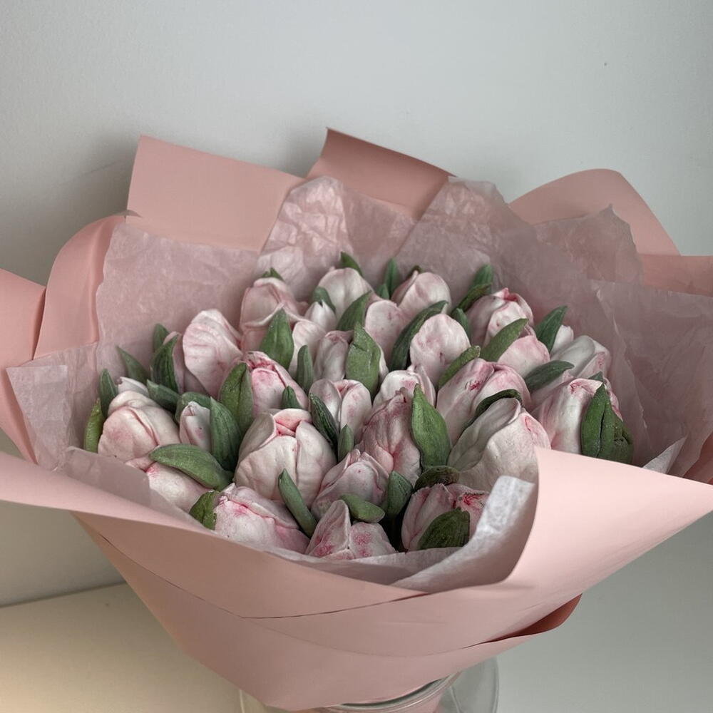 Elegant bouquet of zephyr tulips "Delicate Buds" — a handmade, premium sweet composition 25 cm in diameter. The tulips, shaped as delicate closed buds, are made from apple-vanilla zephyr based on natural fruit puree. Ingredients: fruit puree, pasteurized egg white, sugar and agar. Texture — light, fluffy and melting in the mouth. The bouquet contains approximately 25 tulips. The number of flowers may vary slightly depending on the size of individual buds while maintaining the 25 cm diameter. If you prefer a specific number of flowers, please contact us before placing your order. The bouquet is carefully packed and additionally protected with a transparent protective film during transport. The colors of the tulips and the packaging are selected individually when ordering and may differ from those shown in the photo. Shelf life: up to 7 days from the production date, in a sealed package.