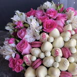 Alstroemeria - 10 pcs macaroons - 10 pcs chocolate-covered strawberries - 30 pcs spray roses - 10 pcs single roses - 10 pcs chocolate-covered blueberries - 20 pcs