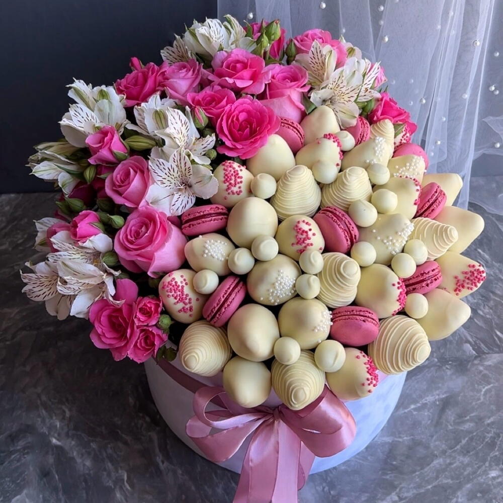 A luxurious tube is an elegant and eye-catching gift. Inside, there is juicy strawberries coated in delicate white chocolate, along with neat pink macarons that add a refined dessert accent. The arrangement is complemented by white and pink flowers: airy alstroemeria, lush spray roses, and expressive single roses. Altogether, it looks harmonious, and truly luxurious-perfect for a special occasion.