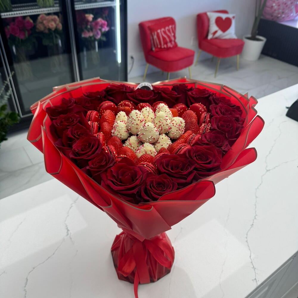 “Heart” – Fruit Arrangement with Roses, Strawberries Macarons is a romantic and elegant fruit arrangement perfect for special occasions in NYC. This exquisite strawberry bouquet includes: Two Dozen Red Roses: Symbolizing love and passion, these roses add a classic and romantic touch to the bouquet, making it an ideal fruit flower bouquet. Chocolate Covered Strawberries: Delicious strawberries dipped in rich chocolate, adding a layer of luxury and sweetness, perfect for a chocolate fruit bouquet. French Macarons: These delicate French treats provide a sophisticated and colorful addition, enhancing the arrangement’s overall appeal as a fancy fruit option. Ideal for birthday fruit bouquet gifts, next day delivery surprises, or as a stunning same day delivery gift in NYC, “Heart” is a testament to love and elegance. It’s also perfect for those looking for gift boxes near me or fruit bouquet delivery near me in NYC.