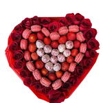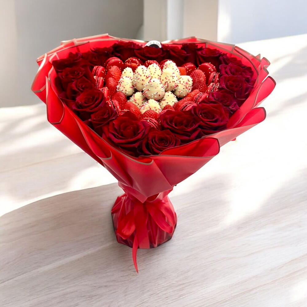 Macarons - 15 pcs Red rose - 20 pcs fresh strawberries - 14 pcs chocolate covered strawberries - 12 pcs