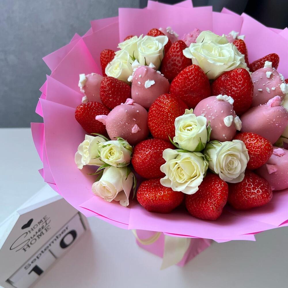 Bouquet of fresh selected strawberries, chocolate covered strawberries and bush roses.