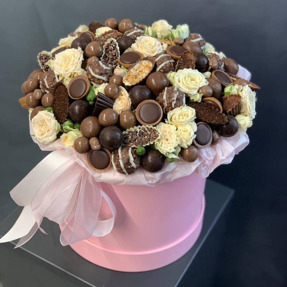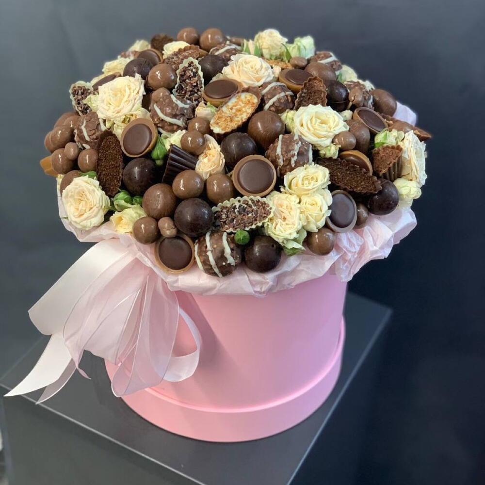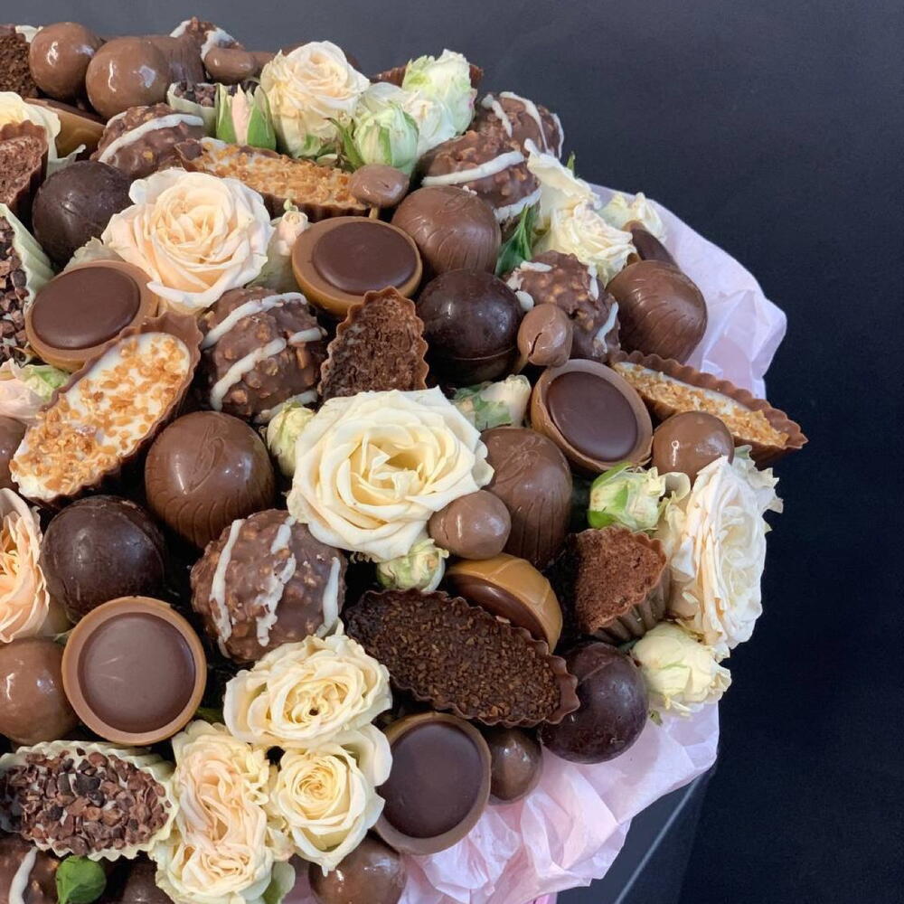 Ferrero Rocher Candies - 1 pcs chocolate-covered raisins - 100 g chocolate-covered almonds - 100 g bush roses - 3 pcs assorted chocolates - 2 pcs шоколад toffee - 1 pcs шоколадки марсианка - 150 g