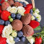 Beautiful wicker basket with fresh berries, chocolate covered strawberries and bush roses.
