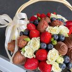 wicker basket - 1 pcs blueberry - 250 g fresh strawberries - 500 g chocolate covered strawberries callebaut (belgium) - 10 pcs white bush roses - 9 pcs