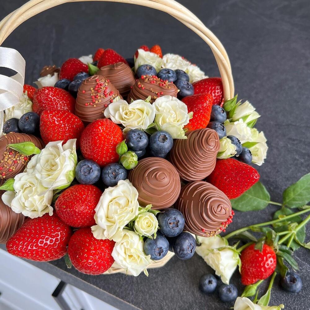 wicker basket - 1 pcs blueberry - 250 g fresh strawberries - 500 g chocolate covered strawberries callebaut (belgium) - 10 pcs white bush roses - 9 pcs