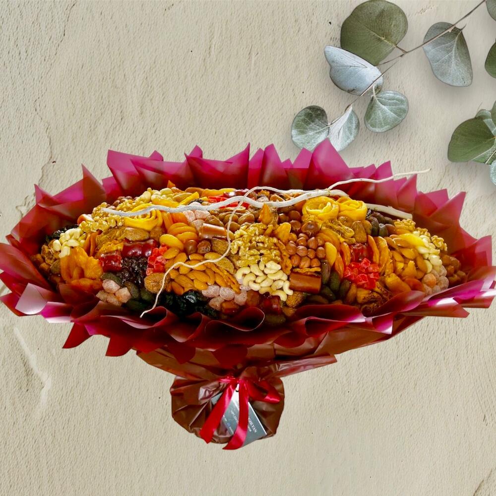 pineapple - 100 g papaya - 200 g mango - 300 g hazelnuts - 100 g prunes - 300 g figs - 300 g walnut - 100 g kumquat - 300 g dates - 200 g churchkhela - 200 g almonds - 100 g peaches - 200 g dried apricots are dark and light - 500 g indian nut - 100 g