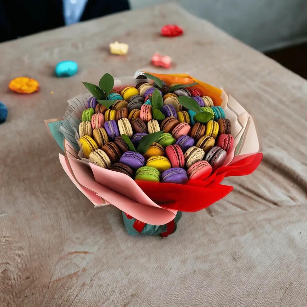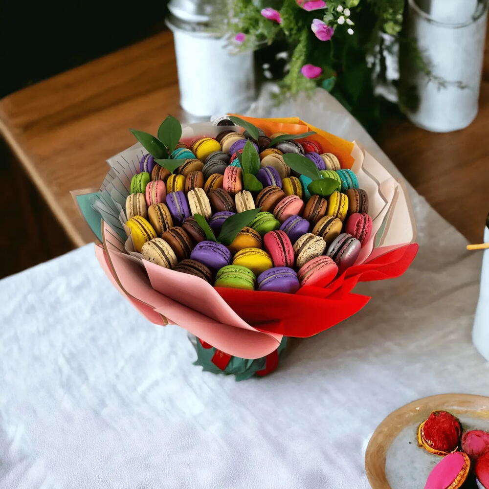 Our “Macarons Gift Bouquet” is a dream come true for macaron lovers! This unique bouquet is entirely made of 50-60 beautifully crafted macarons, offering an array of delicious flavors like pistachio, lavender, birthday cake, lemon, passion fruit, and strawberry. Perfect as a luxurious macaron gift, this bouquet combines the charm of a traditional flower arrangement with the irresistible taste of gourmet macarons. Ideal for any special occasion, it’s not just a gift but an unforgettable experience for anyone who appreciates the delicate art of macarons.