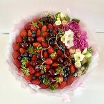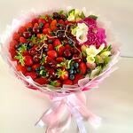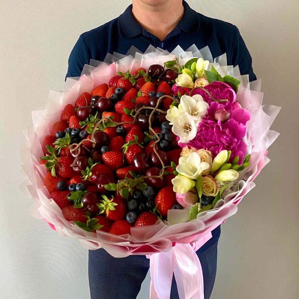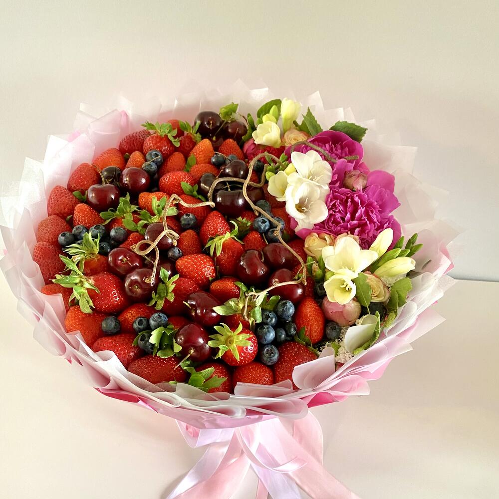 strawberry - 1700 g peonies - 3 pcs cherry - 400 g bush rose - 3 pcs blueberry - 100 pcs korilius - 2 pcs freezia - 5 pcs