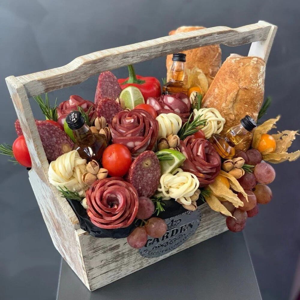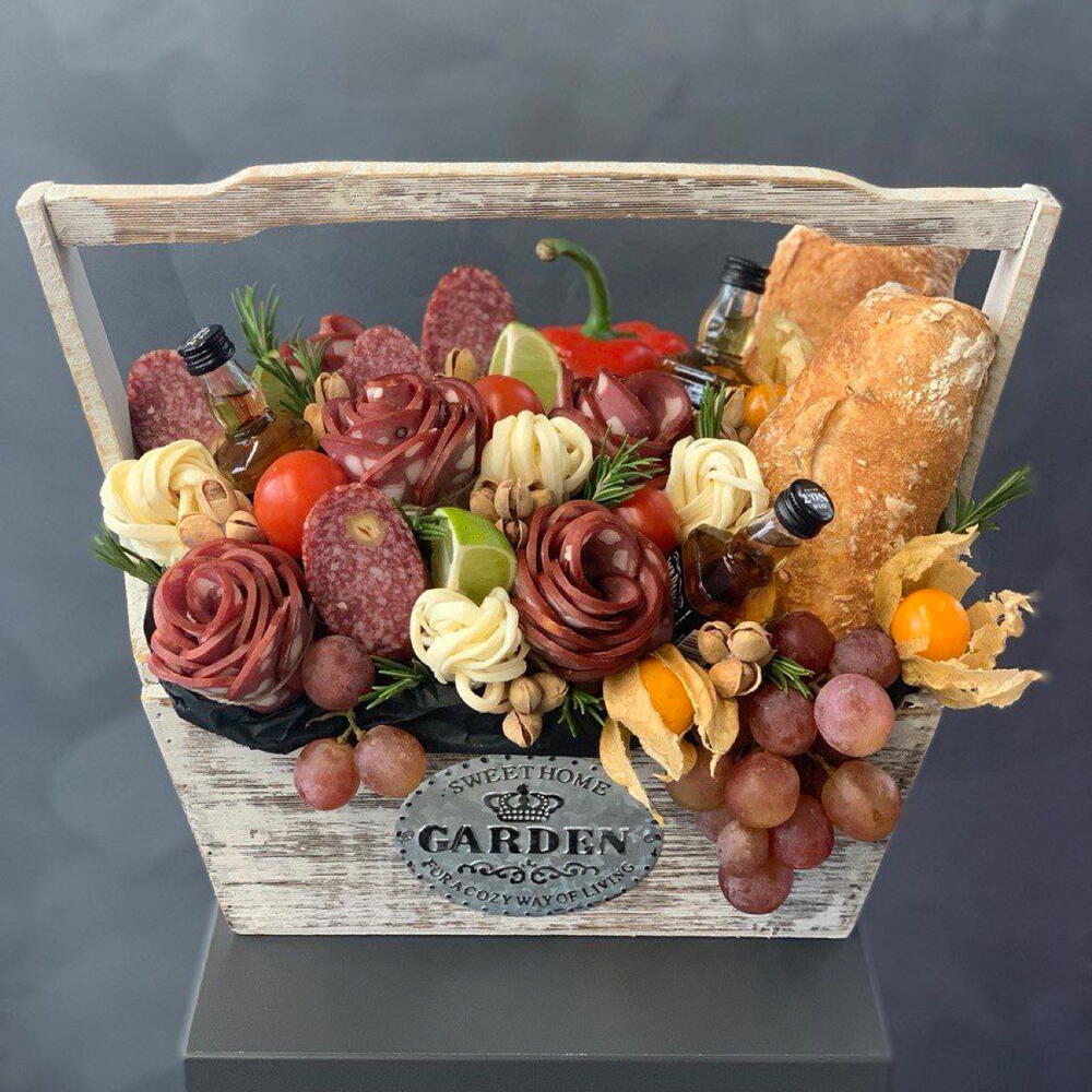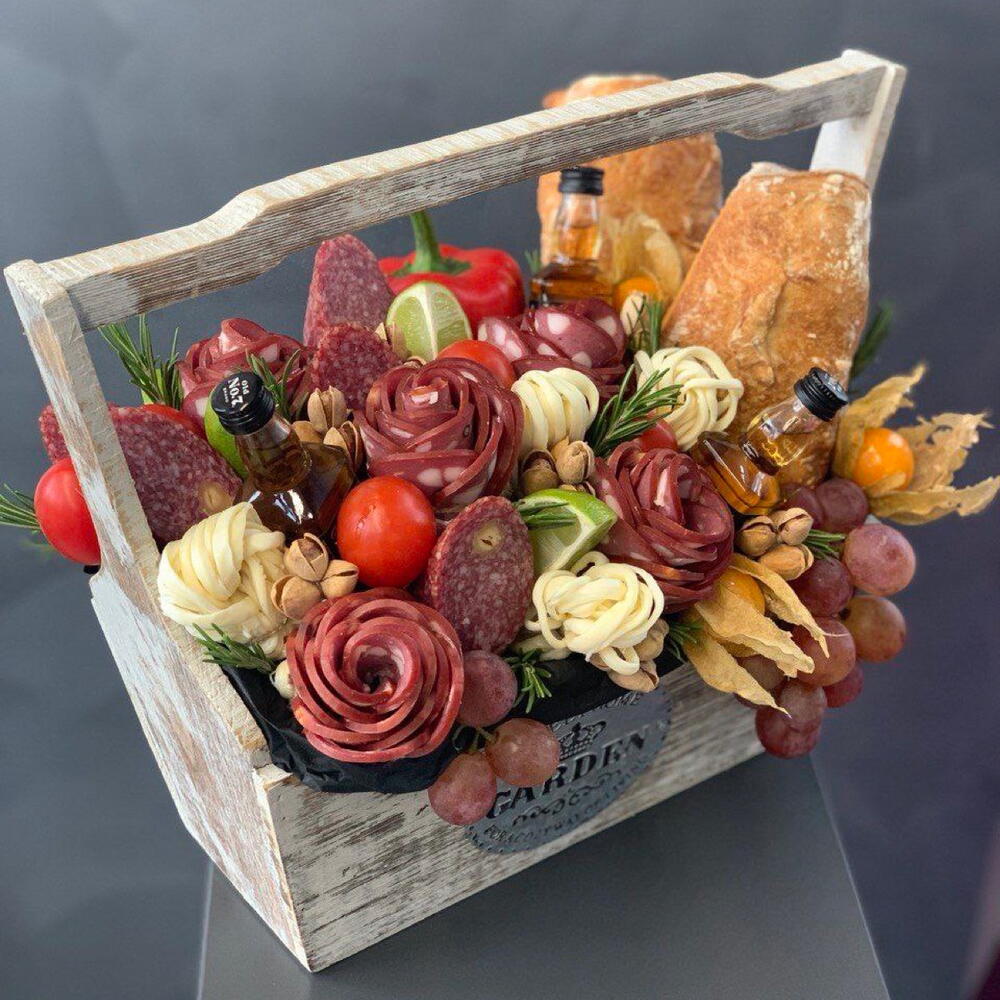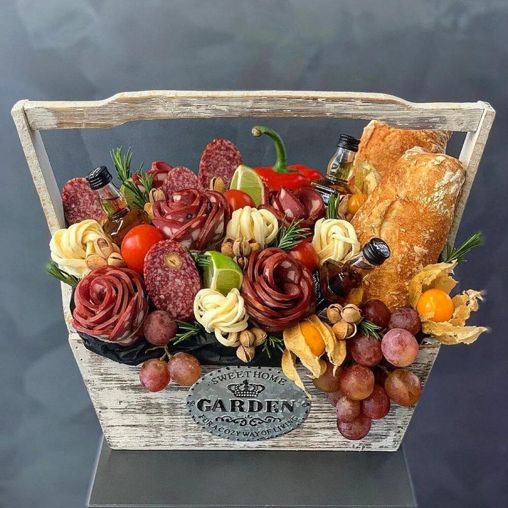 Grape - 200 g Pistachio - 1 pcs Lime - 1 pcs Physalis - 100 g Cherry - 100 g Sweet pepper - 1 pcs rosemary bunch - 1 pcs baguette cheese - 1 pcs сыр ниточный - 2 pcs салями с орехами - 1 pcs виски в миниатюре - 3 pcs колбаса московская - 200 g