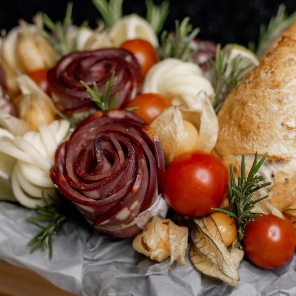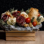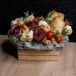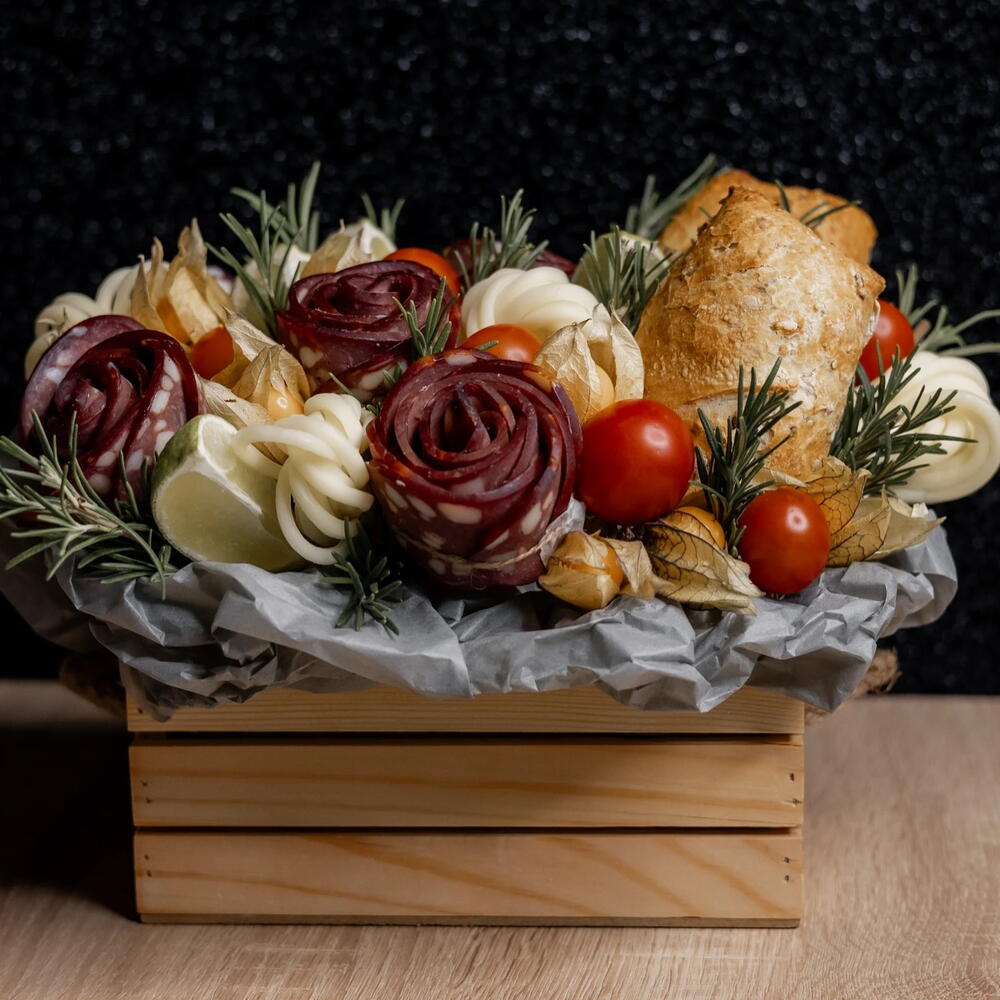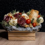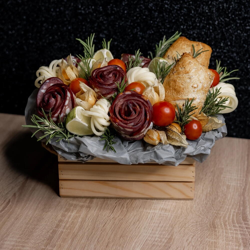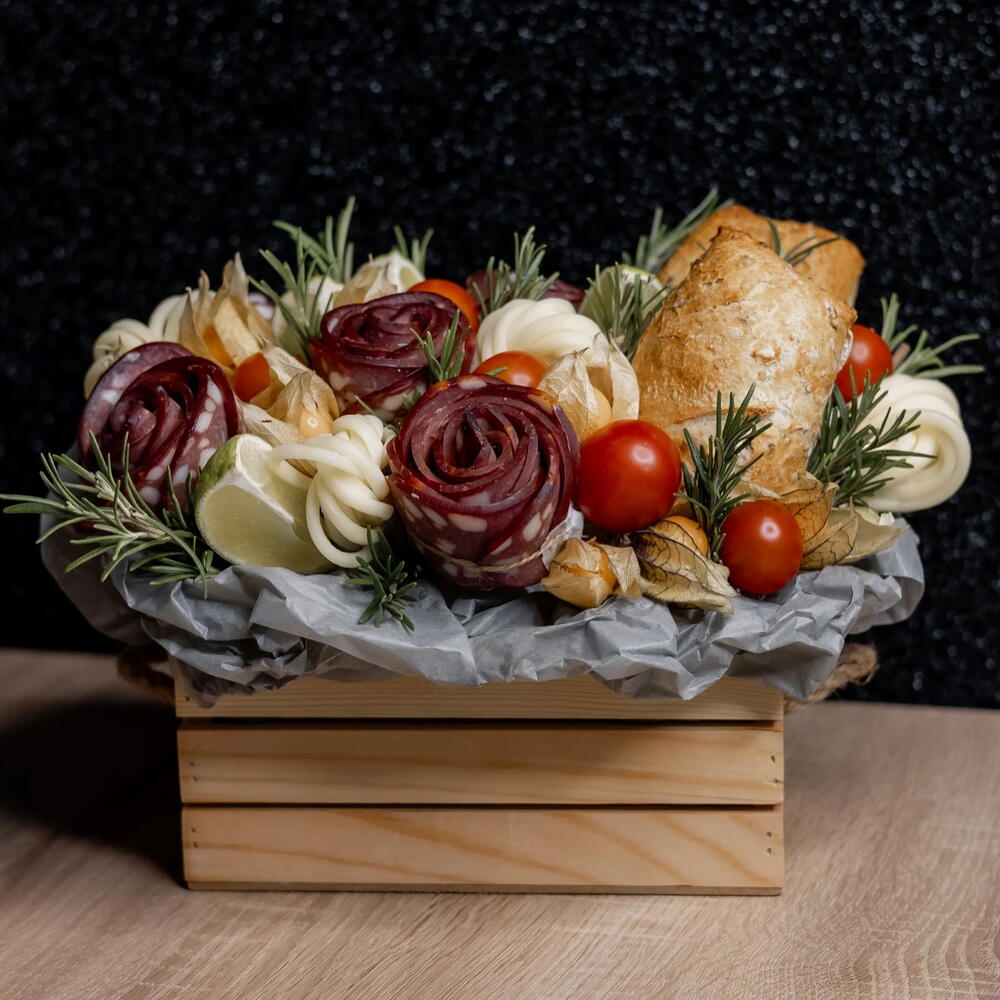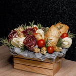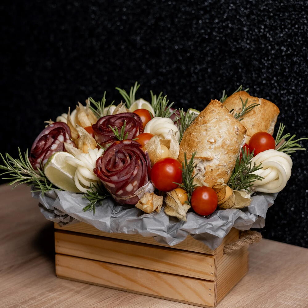 Silence - 2 pcs Lime - 1 pcs Physalis - 1 pcs Wooden box - 1 pcs Thyme - 1 pcs Baguette - 1 pcs cherry tomatoes - 150 g сыр ниточный - 2 pcs колбаса московская - 500 g