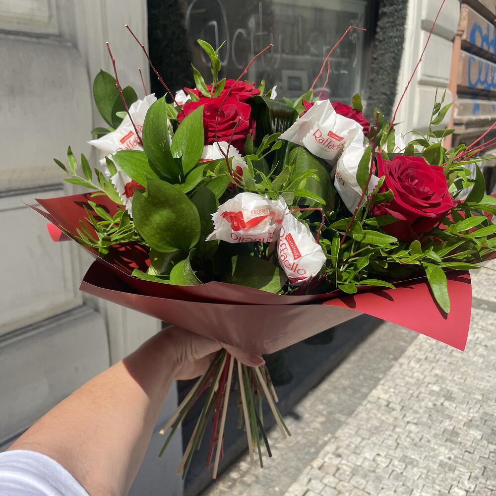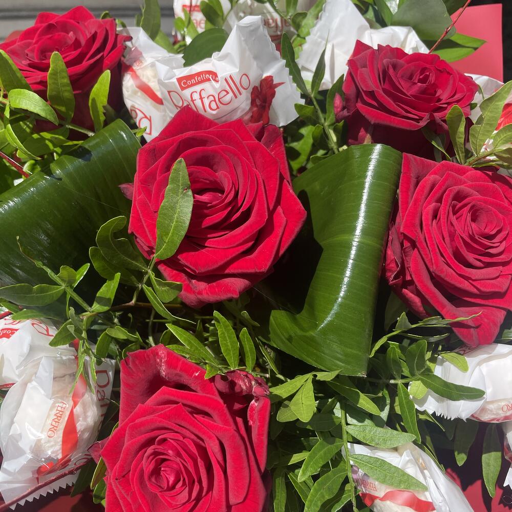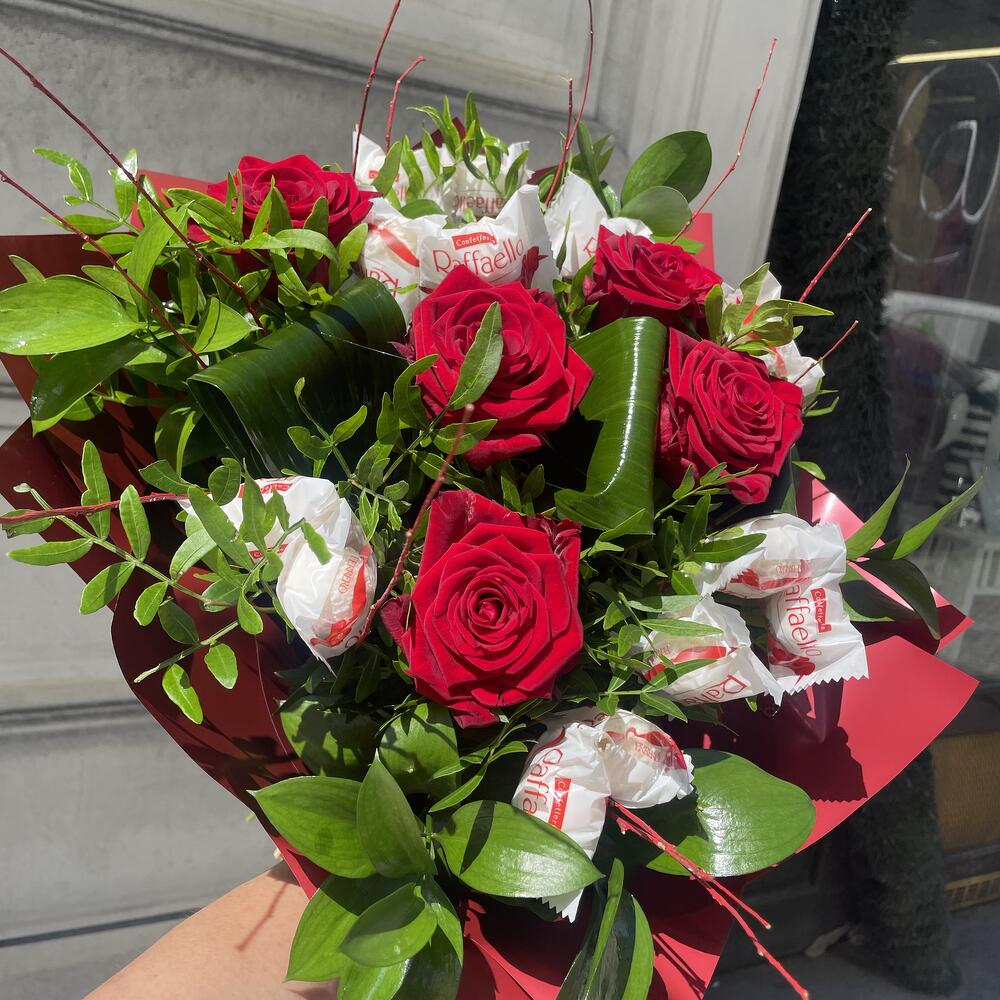 Roses buquet for coconut Raffaelo lovers. Charming mix of flowers and famous Raffaello sweets.