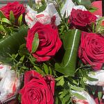 Ruskus - 5 pcs raffaelo - 15 pcs aspidistra leaves - 5 pcs red roses - 5 pcs pistacia leaves - 7 pcs wrap and bow - 1 pcs