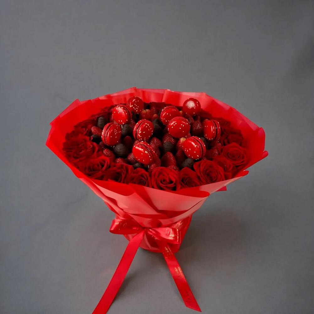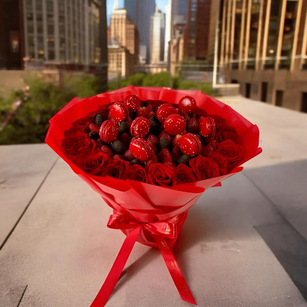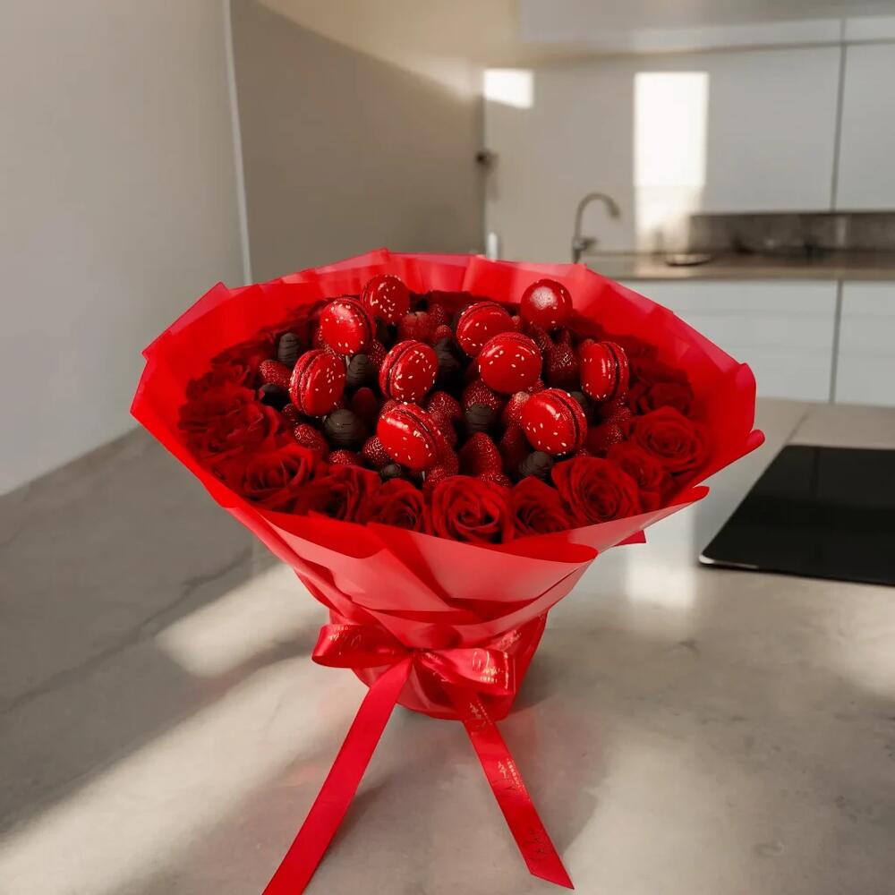fresh strawberries - 40 pcs chocolate covered strawberries - 15 pcs red roses - 20 pcs strawberry macaron - 10 pcs