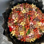 Pistachio - 300 g fuet casademont - 300 g cherry tomatoes - 400 g pepper - 200 g almond - 200 g bacon - 250 g edamame cheese - 800 g sliced beef - 250 g pork - 250 g pickled gherkins - 200 g