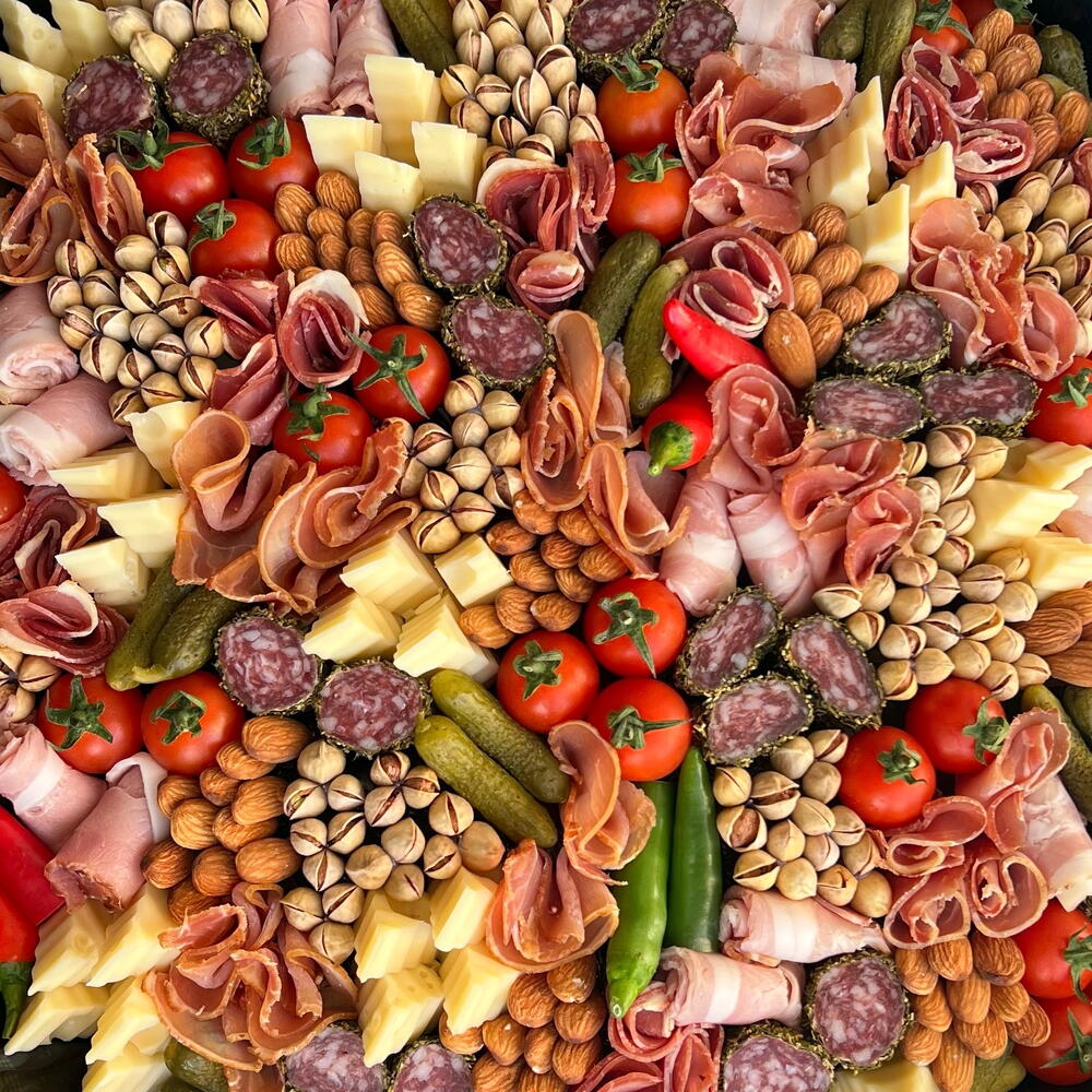 Pistachio - 300 g fuet casademont - 300 g cherry tomatoes - 400 g pepper - 200 g almond - 200 g bacon - 250 g edamame cheese - 800 g sliced beef - 250 g pork - 250 g pickled gherkins - 200 g