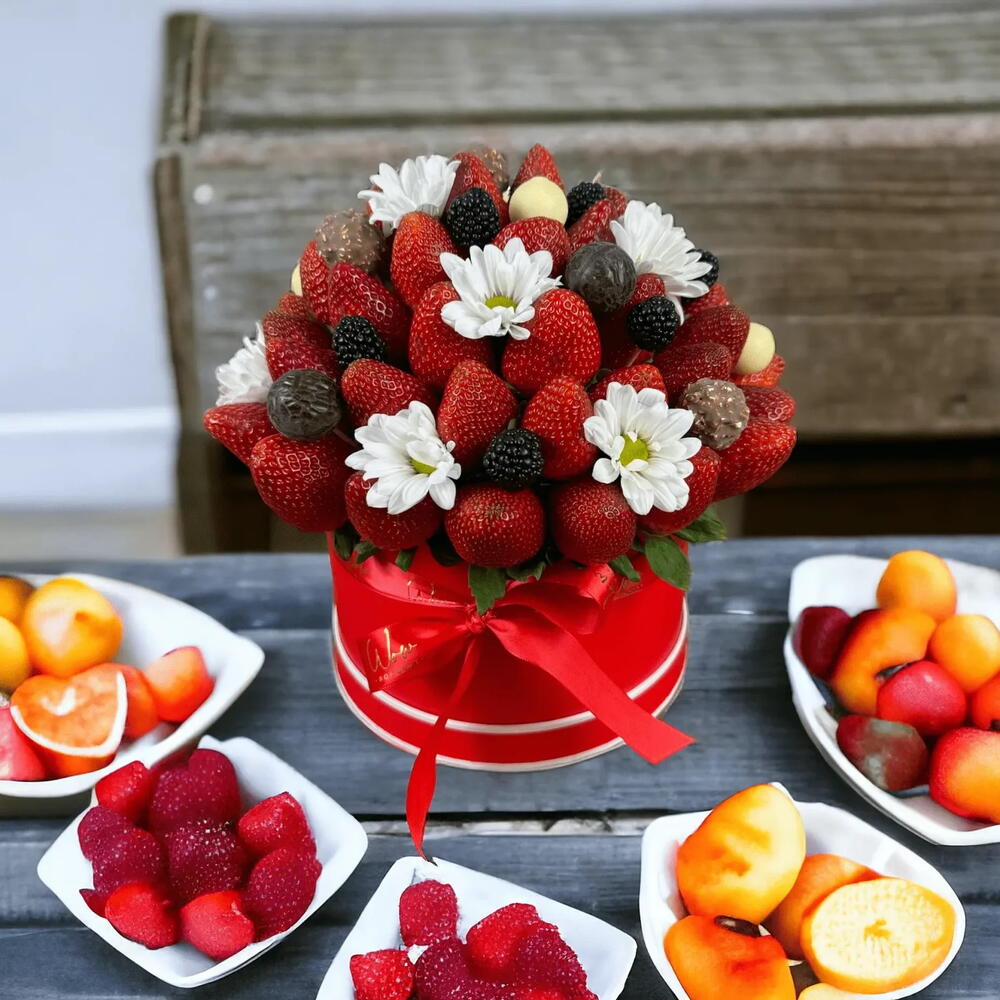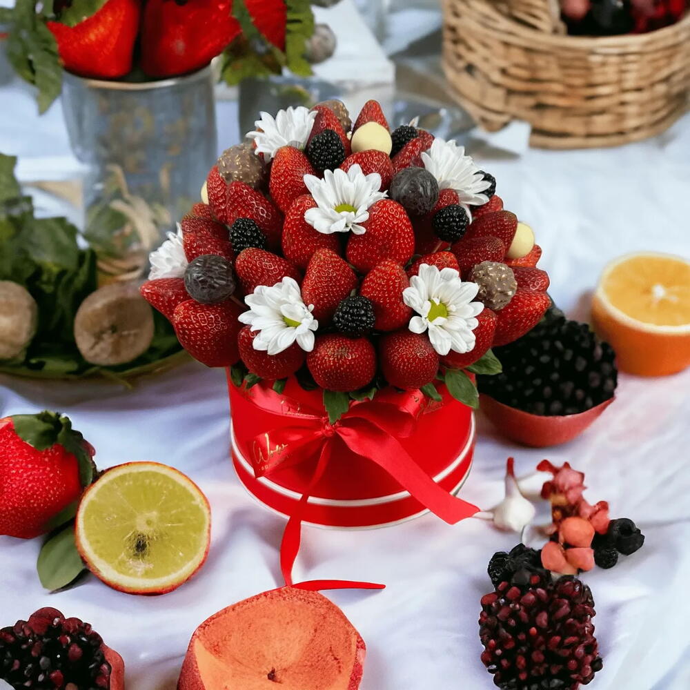 The Strawberries and Ferrero elegantly combines luscious strawberries with luxurious Ferrero Rocher chocolates in a fresh fruit arrangement gift box. What’s inside: Fresh strawberries Ferrero Rocher chocolates Fresh blackberries Flowers