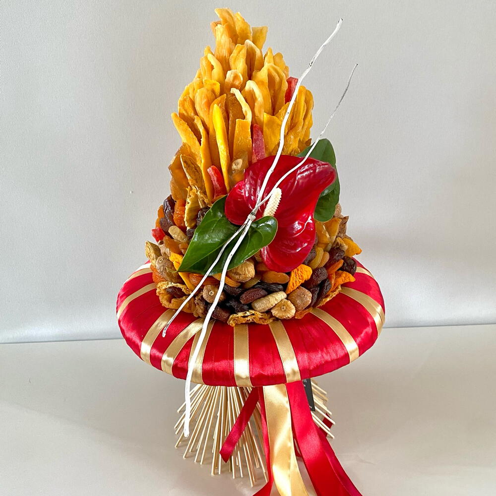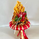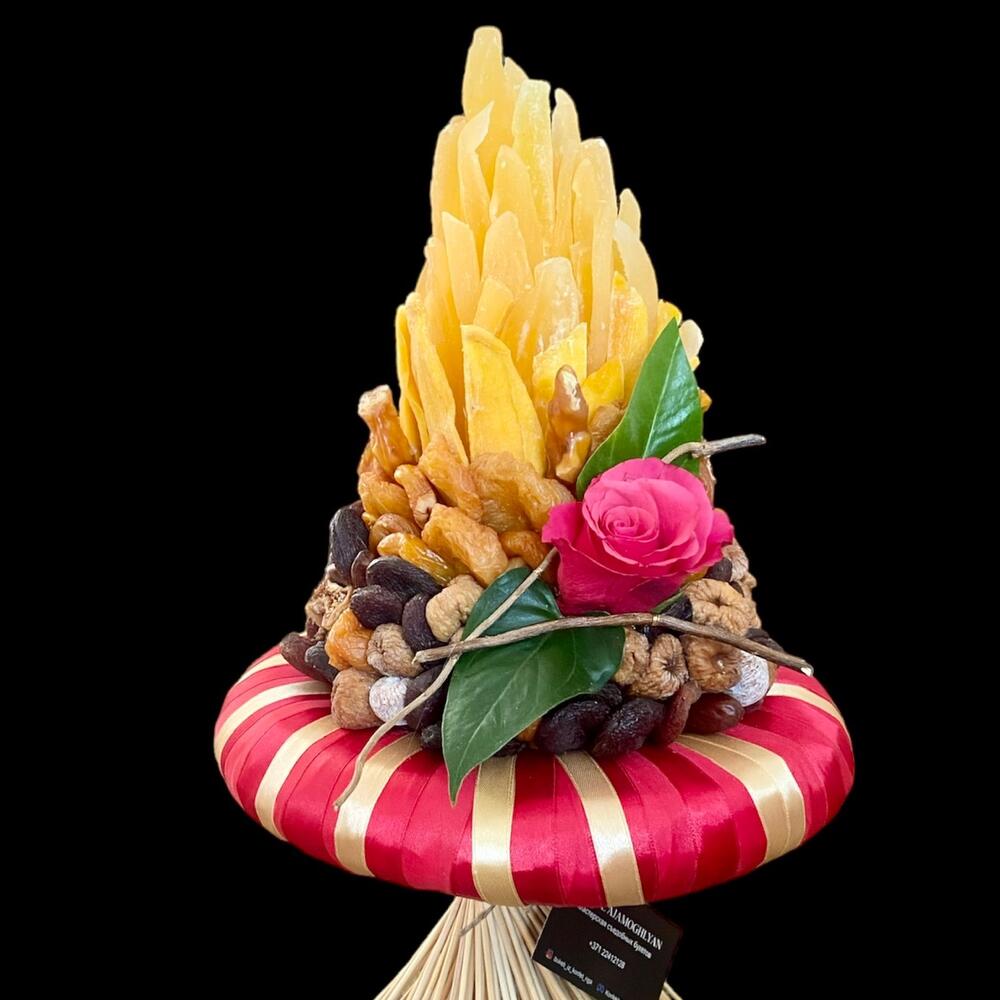 Leaves - 2 pcs rose - 1 pcs pears - 150 g papaya - 450 g dried apricots - 450 g figs - 200 g dates - 200 g churchkhela - 200 g korilius - 2 pcs skeleton - 1 pcs