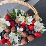 Alstroemeria - 5 pcs wicker basket - 1 pcs chocolate-covered strawberries - 15 pcs blueberry - 250 g floral oasis - 1 pcs fresh strawberries - 500 g