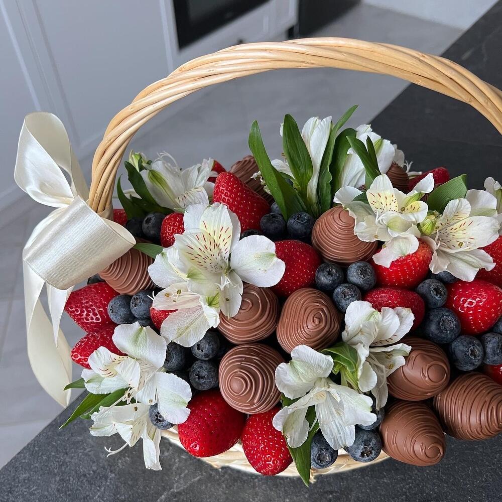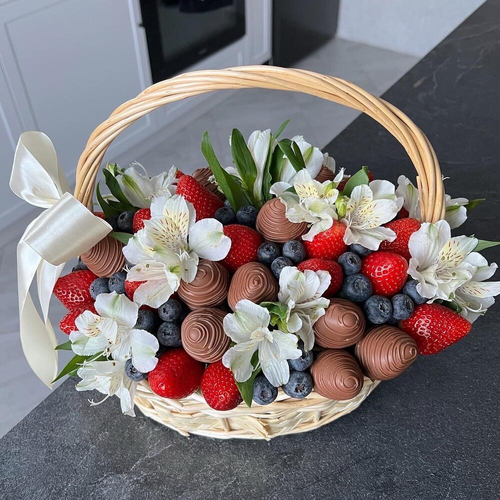 Alstroemeria - 5 pcs wicker basket - 1 pcs chocolate-covered strawberries - 15 pcs blueberry - 250 g floral oasis - 1 pcs fresh strawberries - 500 g