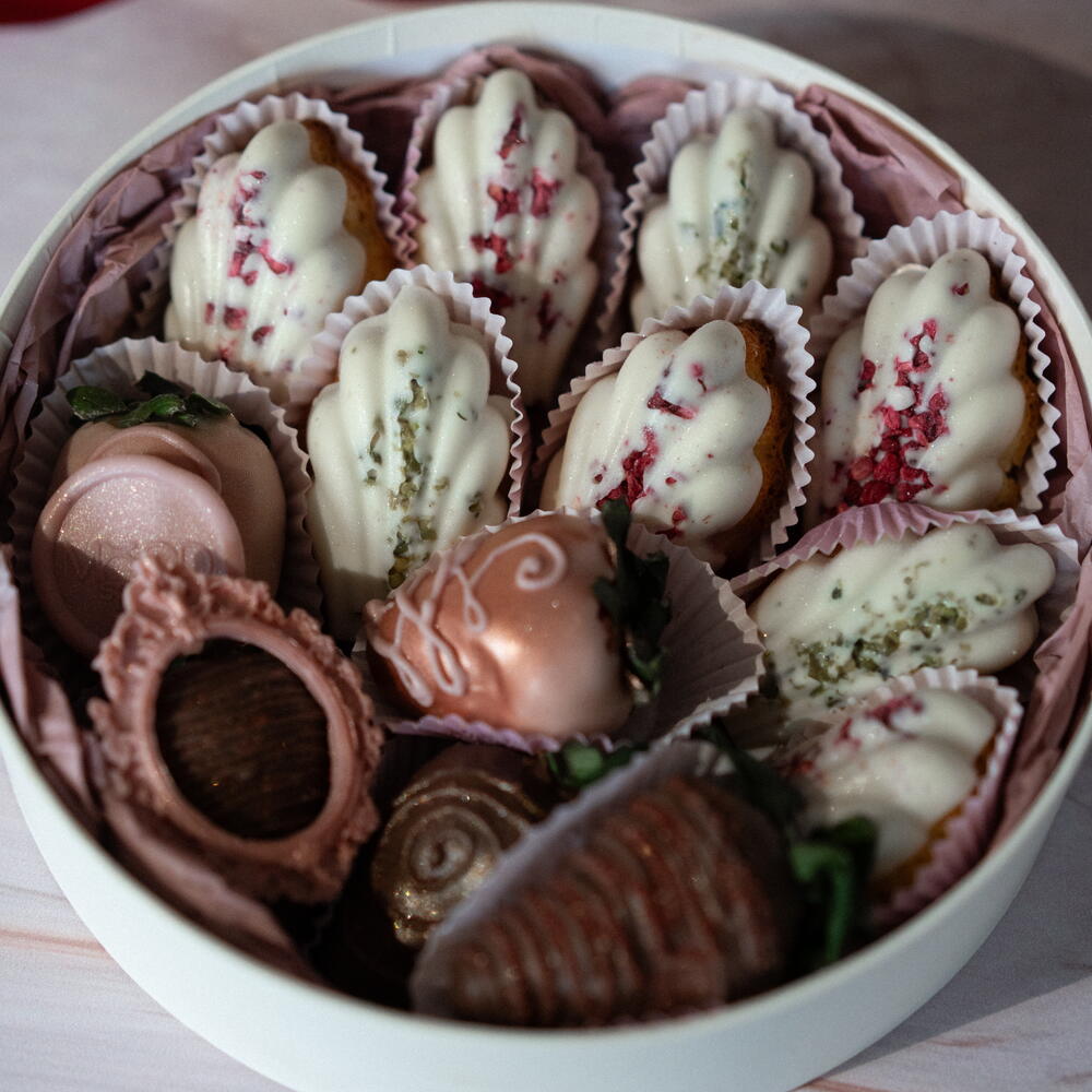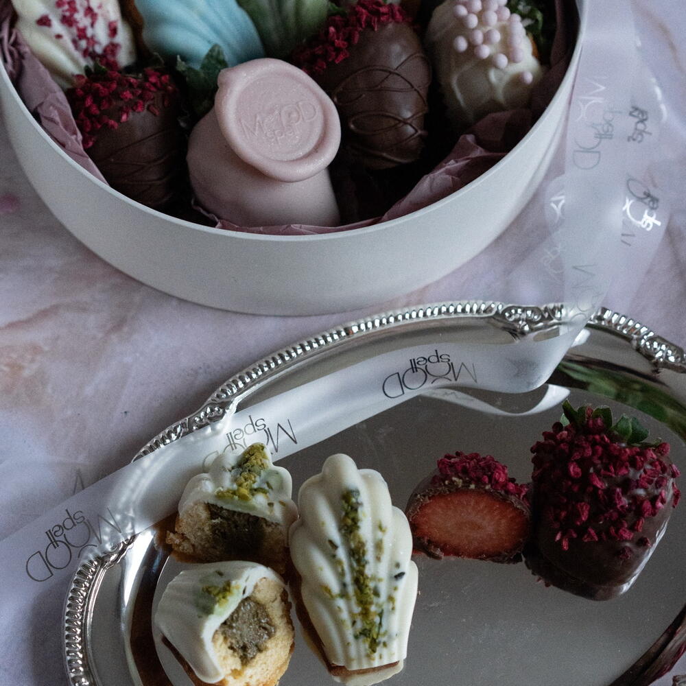 Madeleine (base): Butter, eggs, sugar, wheat flour, almond flour, baking powder, vanilla, pinch of salt. Ganache fillings: Dark/white chocolate, cream, butter. Dubai pistachio paste filling: Premium pistachio paste, white chocolate, cream, butter. Berry confit: Berry purée, sugar, pectin. Fresh strawberries, natural Swiss dark chocolate (cocoa mass, cocoa butter, sugar), white chocolate (cocoa butter, milk powder, sugar), optional decorative toppings.