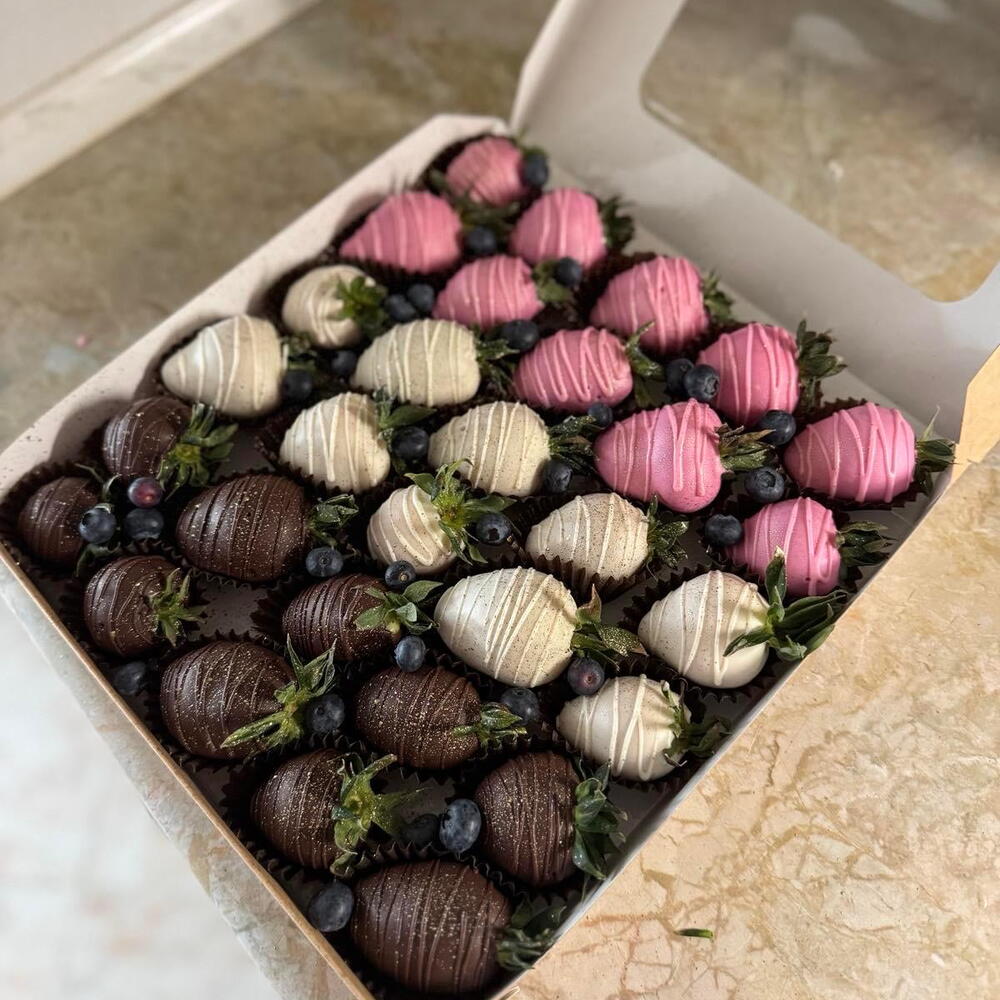 Fresas frescas, chocolate blanco, chocolate con leche,arándanos