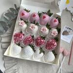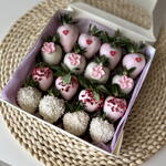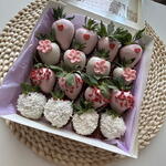Fresas frescas, chocolate blanco, copos de coco, frambuesas liofilizadas Producto embalado en una caja cerrada con cinta adhesiva, bolsa de plástico. El periodo de conservación en la nevera es de 24 horas.