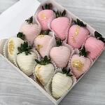 Fresas frescas, chocolate blanco, copos de coco,frambuesas liofilizadas