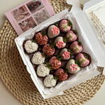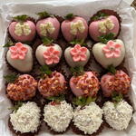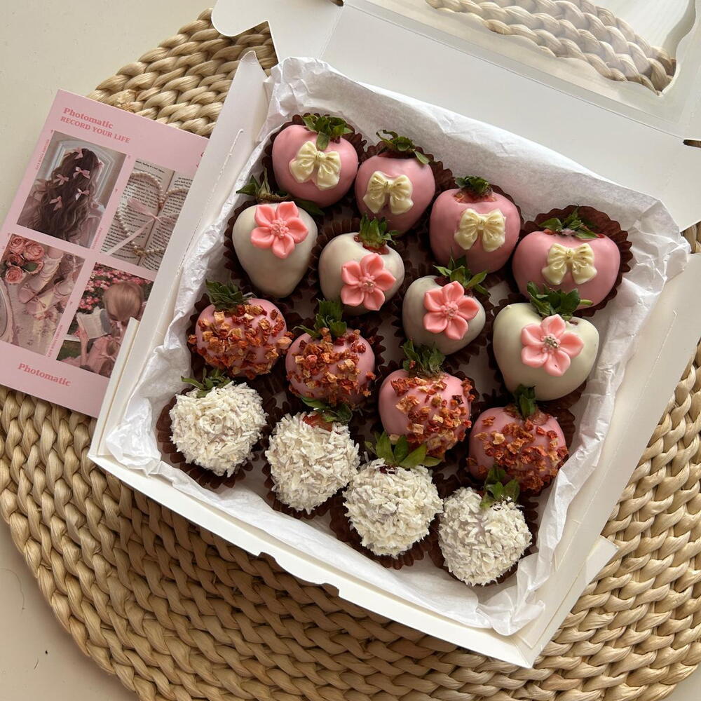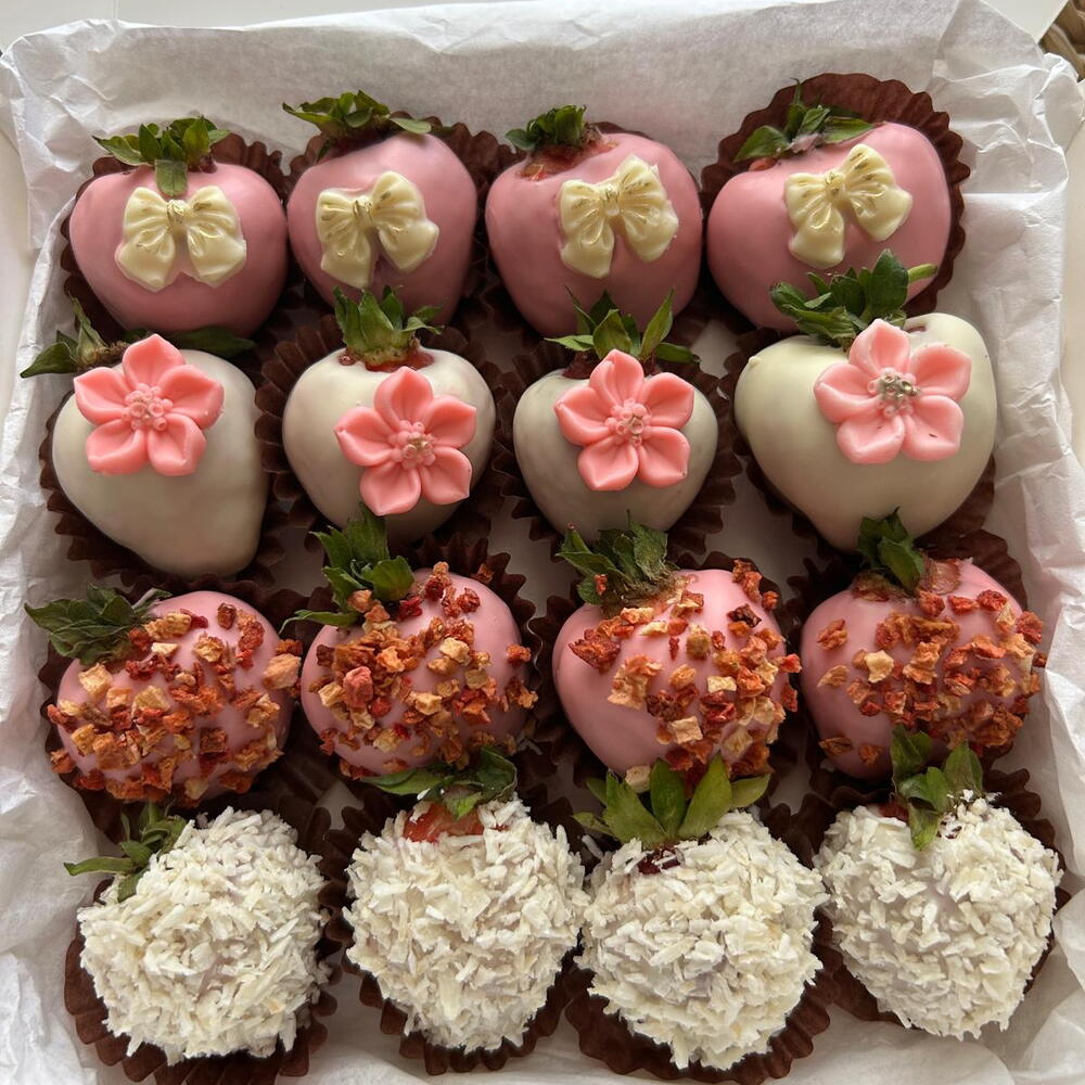 Chocolate blanco belga, chocolate con leche belga, fresas frescas, granulado
