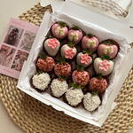 Fresas frescas, chocolate blanco belga 33% cacao, chocolate con leche belga 35% cacao