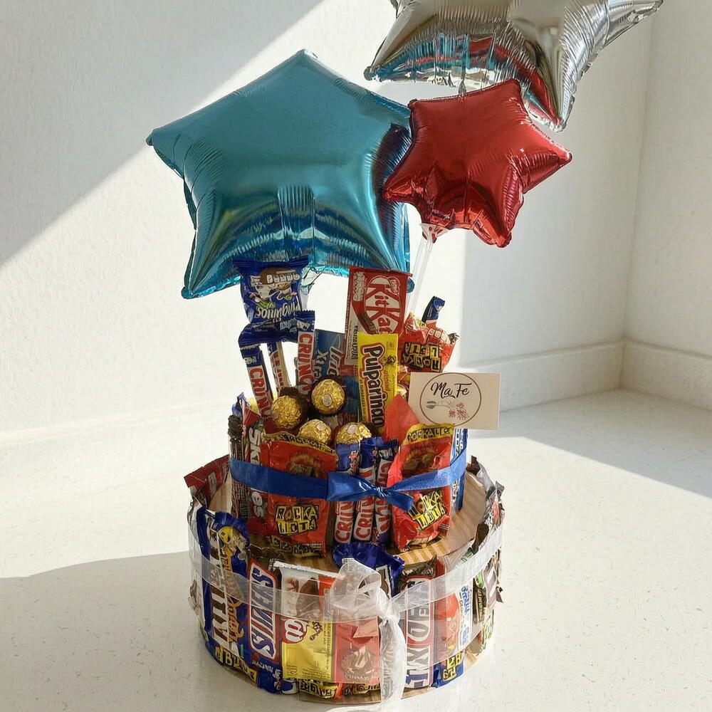 Sorprende con un regalo original y delicioso con nuestro espectacular Pastel de Dulces Premium, una increíble combinación de chocolates y golosinas favoritas presentada en forma de pastel decorativo. Este arreglo incluye una gran variedad de marcas reconocidas como Ferrero Rocher, KitKat, Snickers, MM’s, Skittles y más, acompañado de globos metálicos en forma de estrella que lo hacen aún más especial. Ideal para cumpleaños, celebraciones, regalos sorpresa o detalles únicos, este producto destaca como uno de los mejores pasteles de dulces a domicilio en México. Su diseño creativo y su amplia selección de snacks lo convierten en un favorito para todas las edades.