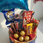 Skittles - 3 ud. Kinder delice - 2 ud. chocolates ferrero rocher - 6 ud. crunch - 3 ud. pulparindo - 2 ud. barras kitkat - 4 ud. chocolates snickers - 4 ud. dulces m&m’s - 3 ud. trident (chicle) - 3 ud. tama roca - 2 ud. pingüinos marinela - 2 ud. globos metálicos estrella - 2 ud.