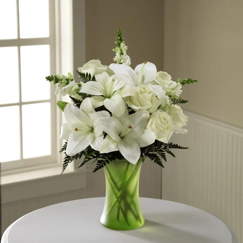 florero de ceramica - 1 ud. follaje seleccionado - 1 ud. arreglo con flores blancas variadas - 1 ud.