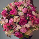 Eustoma - 5 ud. santini rosa - 4 ud. rosa individual de color rosa - 7 ud. peonía - 5 ud. follaje cortado - 10 ud. rosa en rama - 6 ud.