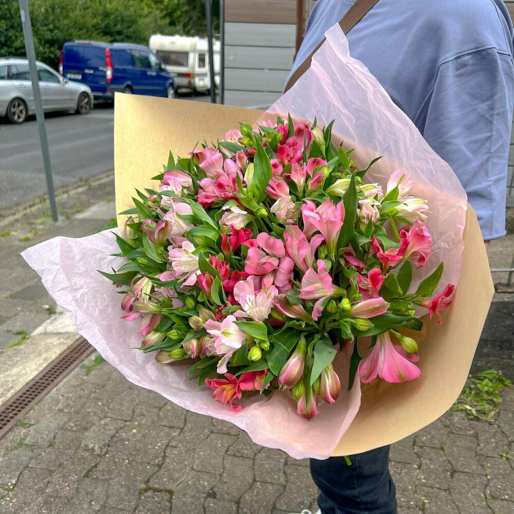 Blumenstrauß Alstroemeria Entdecken Sie die lebendige Schönheit und den exotischen Charme unseres Straußes aus Alstroemerien, auch bekannt als Inkalilien. Dieser üppige Strauß, der mit seinen vielfältigen Farben und einzigartigen Musterungen begeistert, bringt einen Hauch von Tropenflair und floraler Eleganz in jeden Raum. Jede Blüte der Alstroemerien, mit ihren delikaten Linien und strahlenden Farben, erzählt von Anmut und Freude. Die leuchtenden Farbtöne, die von zartem Rosa über kräftiges Orange bis hin zu tiefem Violett reichen können, schaffen ein bezauberndes Farbenspiel, das in jedem Licht glitzert und funkelt. Ihre einzigartige Blütenstruktur und das spielerische Muster fügen dem Strauß eine zusätzliche Dimension von faszinierender Schönheit hinzu. Alstroemerien sind nicht nur ein Fest für die Augen, sondern auch ein Symbol für Freundschaft und Engagement. Mit ihrem langen Haltbarkeitsgrad sorgen sie dafür, dass Ihre Botschaft der Wertschätzung und Zuneigung über lange Zeit hinweg erhalten bleibt. Perfekt als herzlicher Gruß für einen besonderen Anlass, als stilvolle Dekoration für Ihr Zuhause oder als florales Geschenk, das bleibende Erinnerungen schafft – dieser Strauß aus Alstroemerien bringt Farbenpracht und Lebensfreude in jeden Moment. Lassen Sie sich von der exotischen Schönheit dieser Blüten verzaubern und genießen Sie den Hauch von Eleganz, den sie in Ihr Leben bringen. Wir achten ständig auf die letzten Trends im Bereich des Floristikdesigns und unsere Bouquets sind die Reflexion davon. Bei der Zusammenstellung verwenden wir nur ganz frische Komponente und die modernsten Materialien. Unser Team steckt besondere Liebe zum Detail in jedes Arrangement, deshalb finden Sie immer einen Sticker mit unserem Logo und ein Firmen Bändchen als Qualitätssiegel an jeder Komposition. Hinweise: Die Erstellung jedes Arrangements erfolgt individuell mit viel Leidenschaft für unser Handwerk und somit ist auch jeder Strauß ein Einzelstück und kann etwas von Abbildungen abweichen. Es handelt sich um ein Naturprodukt, dadurch sind naturbedingte Abweichungen in der Form, Farbe oder Größe zu den Angaben möglich! Es wurde unter anderem Saisonware verwendet und können nach Bedarf durch unsere Floristen ersetzt werden. Das Erscheinungsbild und die Farbgebung bleiben erhalten. Jetzt ganz bequem bestellen und an Ihre Wunschadresse liefern lassen. Individuelle Anfragen nehmen wir sehr gerne entgegen, dazu einfach eines unserer vielen Kontaktmöglichkeiten nutzen. Dem Blumenstrauß legen wir eine Anleitung zur Pflege und ein Mittel zur Verlängerung der Lebensdauer bei. Alle Preise inkl. MwSt. und zzgl. Lieferkosten