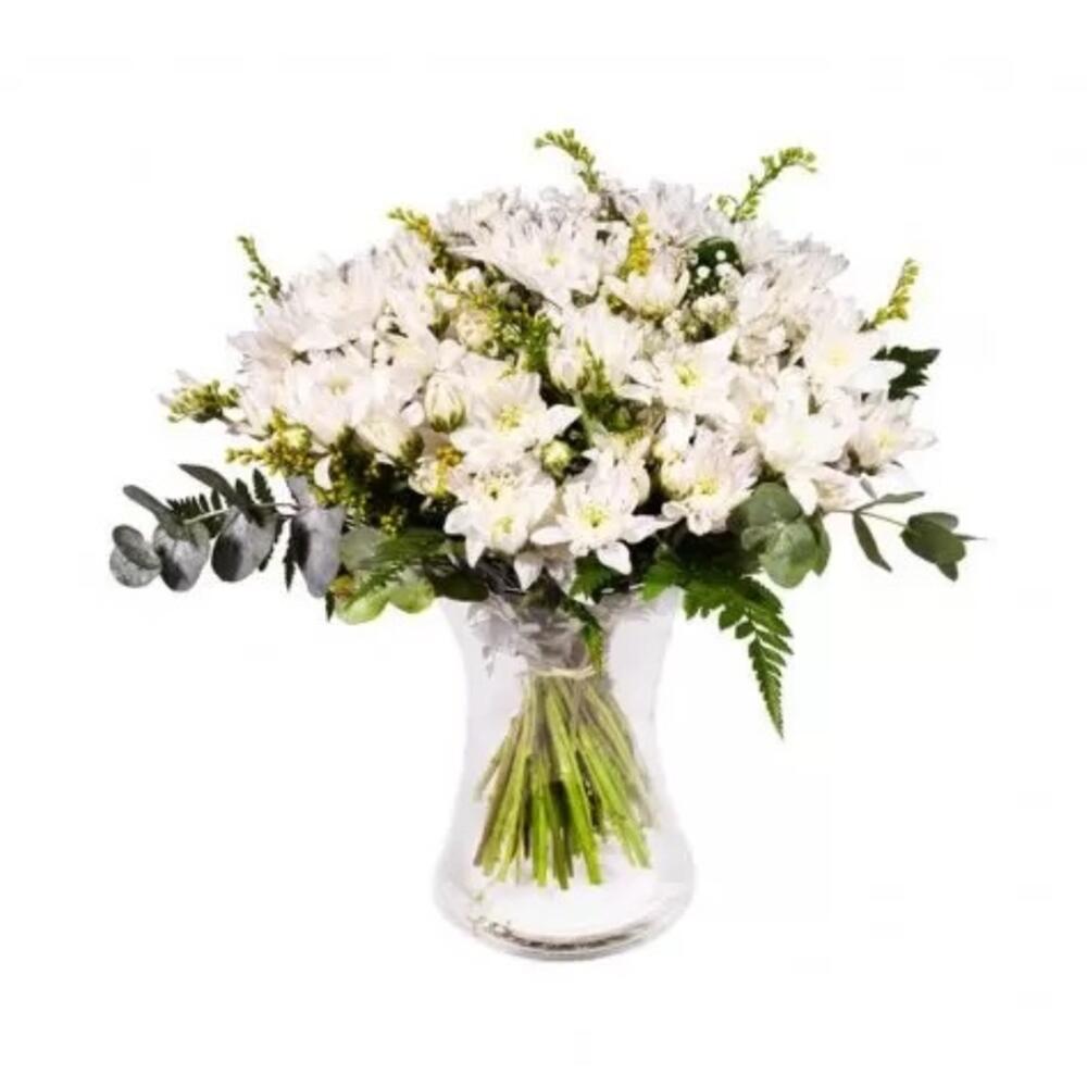Solidago - 5 ud. jarrón transparente - 1 ud. spray de crisantemos - 7 ud.