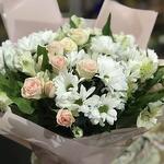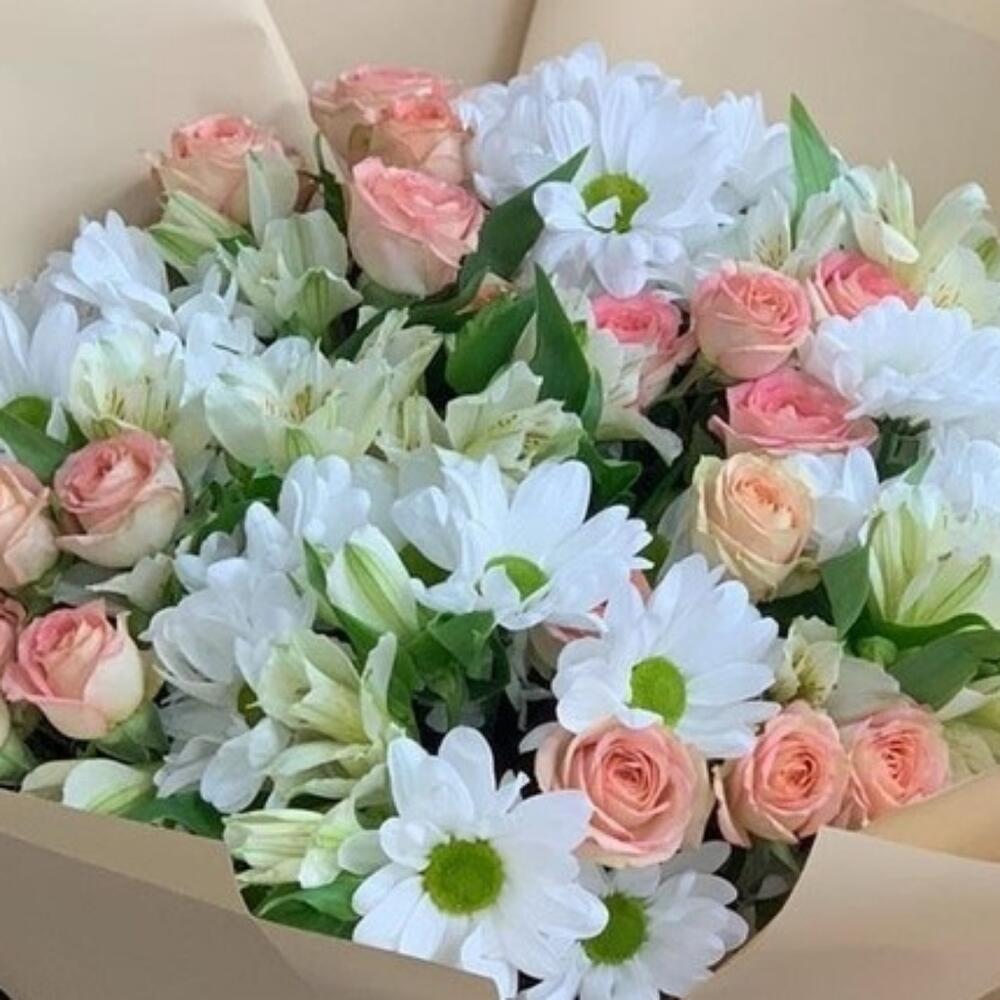 La cinta - 1 ud. empaque de diseñador - 1 ud. rosal - 3 ud. decorative greenery - 5 ud. alstroemeria - 5 ud. bush carnations - 4 ud.
