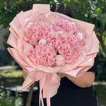 Cinta de raso - 2 ud. Тишью - 5 ud. Hortensia rosa - 5 ud. Peonía holandés - 7 ud. Embalaje coreano - 5 ud.