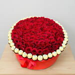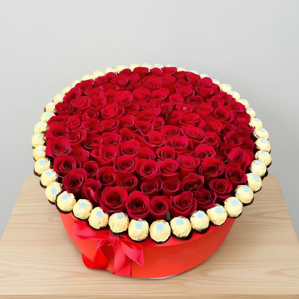 Una composición espectacular que combina lujo y romanticismo en su máxima expresión. Las rosas rojas forman una superficie densa y elegante, mientras que el borde de chocolates aporta un toque dulce y exclusivo. Perfecto para sorprender a lo grande y expresar un amor profundo e inolvidable.